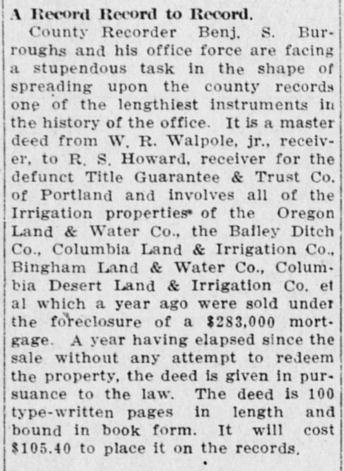 A Record Record to Record. County Recorder Benj. S. Burroughs and his office force are facing a stupendous task in the shape of spreading upon the county records one of the lengthiest instruments in the history of the office. It is a master deed from W. R. Walpole, jr., receiver, to R. S. Howard, receiver for the defunct Title Guarantee & Trust Co. of Portland and involves all of the Irrigation properties of the Oregon Land & Water Co., the Bailey Ditch Co., Columbia Land & Irrigation Co., Bingham Land & Water Co., Columbia Desert Land & Irrigation Co. et al which a year ago were sold under the foreclosure of a $283,000 mortgage. A year having elapsed since the sale without any attempt to redeem the property, the deed is given in pursuance to the law. The deed is 100 type-written pages in length and bound in book form. It will cost $105.40 to place it on the records.