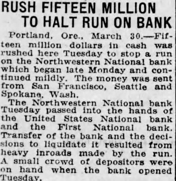 RUSH FIFTEEN MILLION TO HALT RUN ON BANK Portland, Ore., March dollars cash was Tuesday run the bank which began Monday and continued mildly. The money sent from San Francisco, Seattle bank passed the United States National bank First National bank. Transfer the bank and decisions from inroads the run. crowd hand when the bank opened Tuesday.