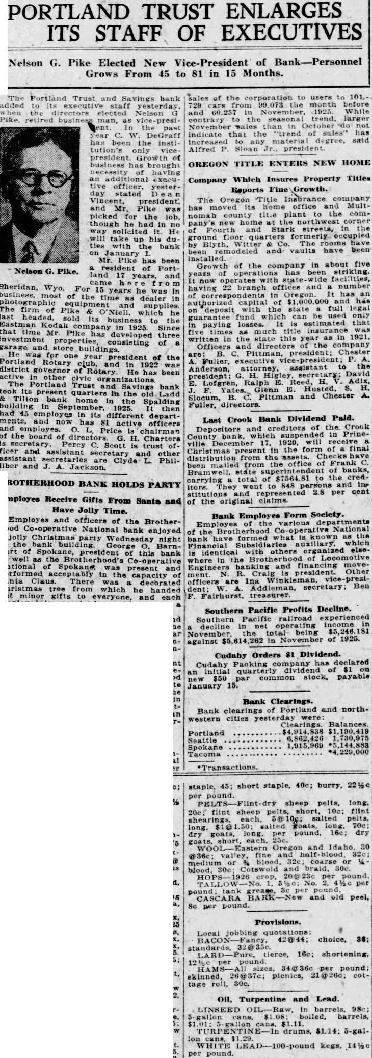 PORTLAND TRUST ENLARGES ITS STAFF OF EXECUTIVES Nelson G. Pike Elected New Vice-President of Bank-Personnel Grows From 45 to 81 in 15 Months. The Portland Trust and Savings bank added to the elected Nelson retired man, as year DeGraff has been the institution's vicepresident of business has brought having an stated Dean Vincent, president Mr. Pike picked for the though he solicited take up his du ties with the bank on January Mr. Pike has been resident of Nelson G. Pike. Sheridan, For 15 years he was business, most of the as dealer in and supplies The of Pike which he last Eastman sold Its the investment that time Mr. Pike has developed 1925. Since consisting of a one Portland Rotary year and in 1922 was the district governor He been The Portland Trust civic organizations. took Tilton bank quarters and Savings the bank home the Spalding building had its different departments, and employes. and has active officers Price chairman of the board of G. H. Charters Percy Scott ficer and assistant other assistant liber and are Clyde Phil- sales of the users 729 the month before While contrary the seasonal trend, larger than in not indicate that the "trend sales" has any material degree, said Alfred P. Sloan OREGON TITLE ENTERS NEW HOME Company Which Insures Property Titles Reports Fine Growth. The Oregon Insurance its and Multnomah has to the company's new home the northwest Fourth and streets, in the Blyth, The rooms have and vaults have been Growth of the company in about years has been striking. now 22 branch offices and number has authorized of has on deposit with the state full legal guarantee fund which can paying estimated insurance that was five as much title written in the state this in 1921. Officers the are Pittman, president: Fuller, executive assistant the Anderson, president: David F. Glenn Husted. S. H. and Chester A. Fuller, Last Crook Bank Dividend Paid. creditors the Prine- Crook 1920, will the final Christmas distribution from the Frank from been Bramwell, the banks, total $7564.81 to carrying They to 848 2.8 and cent Inc per of the original claims. Bank Employes Form Society various departments the the of National formed what as bank which is Financial organized Locomotive elsewhere the Engineers and financing moveOther officers Ina presi- Ben Addleman, treasurer. Southern Pacific Profits Decline. Southern Pacific experienced in decline operating being against in of 1925. Cudaby Orders $1 Dividend. Packing company Cudahy quarterly dividend on new $50 stock, payable January Bank Clearings. Bank Portland and northwestern cities Balances Portland Seattle Spokane 1,915,969 *4,229,000 Tacoma staple, 45; short staple, 40c; burry. 2216c per -Flint-dry sheep pelts, long. flint sheep flint salted dry long, goats, long. pound. 16c; dry Oregon and Idaho, 30 32c coarse or medium or Cotswold and braid, per No. per pound Provisions. Local 42@44; choice, 36: tage 30c. Oil, Turpentine and Lead. gallon per pound.