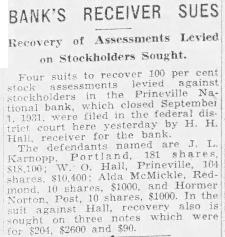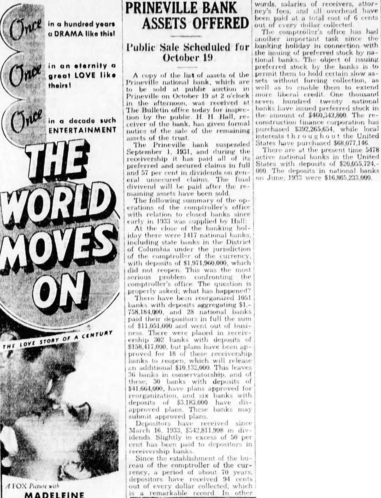 LOVE like A copy of the list of assets of the great Prineville national bank, which are theirs! to be sold public auction in Prineville on October 19 at o'clock in the afternoon, was received at The Bulletin office today for inspection by the public. H. H. Hall, rein a decade such ceiver of the bank, has given formal ENTERTAINMENT notice of the sale of the remaining assets of the trust The Prineville bank suspended September 1931 and during the THE receivership it has paid all of its preferred and claims in full and 57 cent in dividends on general claims The final divivend will be paid after the remaining assets have been sold The following summary of the opWORLD erations of the comptroller's office with relation to closed banks since early in 1933 was supplied by Hall At the close of the banking holiday there were 1417 national banks, including state banks in the District MOVES of Columbia under the jurisdiction of the comptroller of the currency with deposits of .971,960,000 which did not reopen. This was the most serious problem confronting the comptroller's office The question is ON properly asked: what has happened? There have been reorganized 1051 banks with deposits aggregating $1.758.184.000. and 28 national banks paid their depositors in full the sum of and went out of busiCENTURY ness. There were placed in receivership 302 banks with deposits of $158,417,000 but plans have been approved for 18 of these receivership banks to reopen, which will release additional $10,132,000 This leaves 36 banks in conservatorship, and of these 30 banks with deposits of $41,664,000. have plans approved for reorganization, and SIX banks with deposits of $3,183,000 have disapproved plans These banks may submit approved plans. have received since March 16 1933. in dividends Slightly in excess of 50 per cent has been paid to depositors in receivership Since the establishment of the bureau of the comptroller of the currency, a period of about 70 years, depositors have received 94 cents FOX Picture out of every dollar collected. which is a remarkable record In other MADELEINE words. salaries of receivers, attorney's fees, and all overhead have been paid at a total cost of 6 cents out every dollar collected The comptroller's office has had another important task since the banking holiday in connection with the issuing of preferred stock by national banks The object of issuing preferred stock by the banks is to permit them to hold certain slow assets without foreing collection, well to enable them to extend more liberal credit One thousand seven hundred twenty national banks have preferred stock in the amount of $460,342,800 The reconstruction finance corporation has purchased $392,265,654. while local interests the United States have purchased $68,077,146 There are at the present time 5478 active national banks in the United States with deposits of $20,055,724. 000 The deposits in national banks on June 1933 were