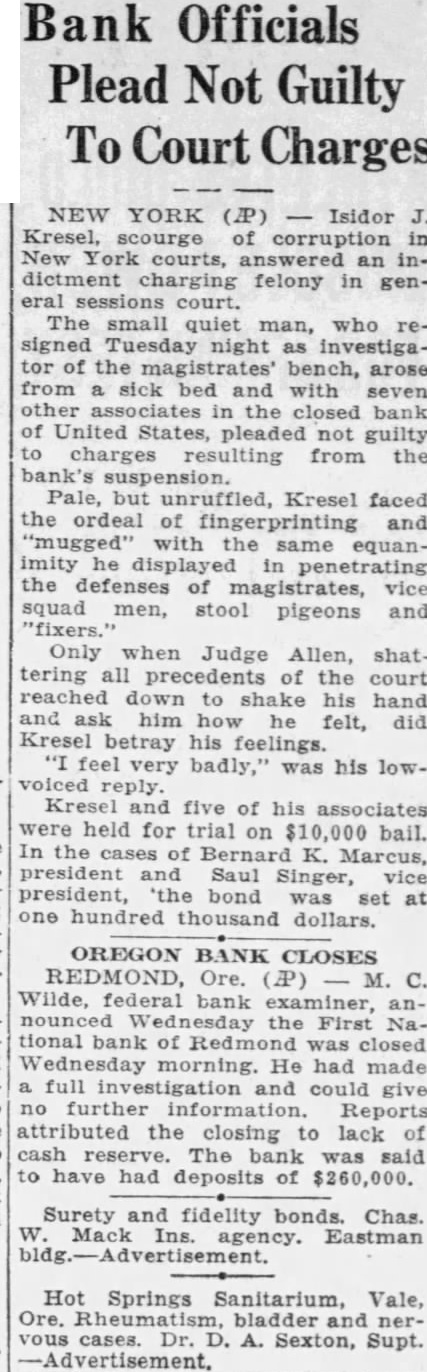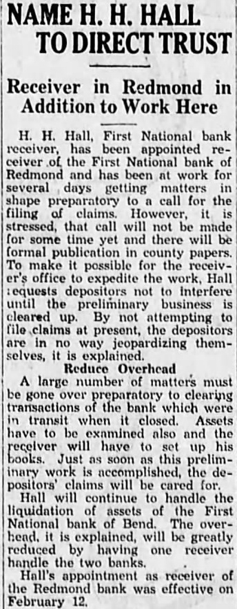 National bank of Redmond, $16.693 or a total of $60,900 50 in the two banks of the county which are in the hands of receiver The Deschutes county treasurer holds $21,591 86 in bonds as security for the Redmond bank funds These bonds are as follows: Central Oregon Irrigation district, $7,000: Squaw West Side district warrants, $235.00; Suttle Lake district warrants $8,338.86 In connection with this security the audit report states: "An examination of the records of Jefferson county should be made to determine whether or not the Suttle Lake district is placing on the county rolls the necessary levy to take up the outstanding warrants of the district, as will require a payment of at least 44 cents on the dollar on the Suttle Lake district warrants in order that the county may recover the full balance in the First National bank of Redmond This is with the assumption that the bonds of the Central Oregon Irrigation district and Squaw creek irrigation district will be paid in full A portion of the $16,693 13 in the First National bank of Redmond insolvent, is agency funds for which the county is responsible.'