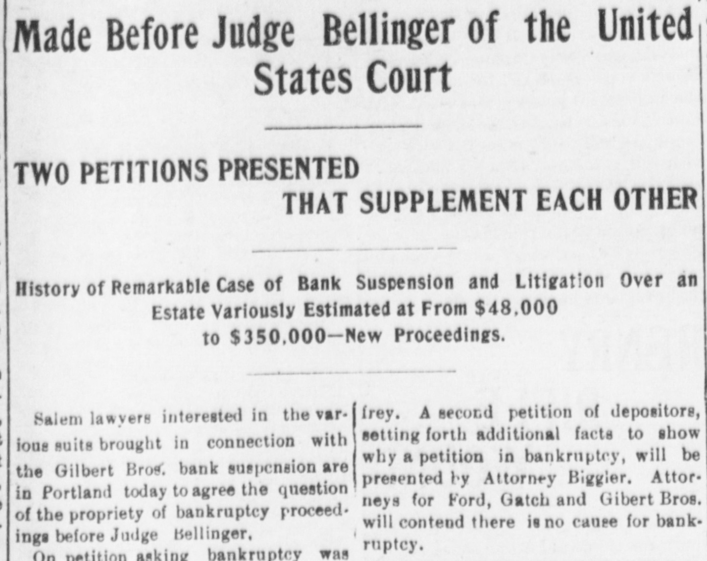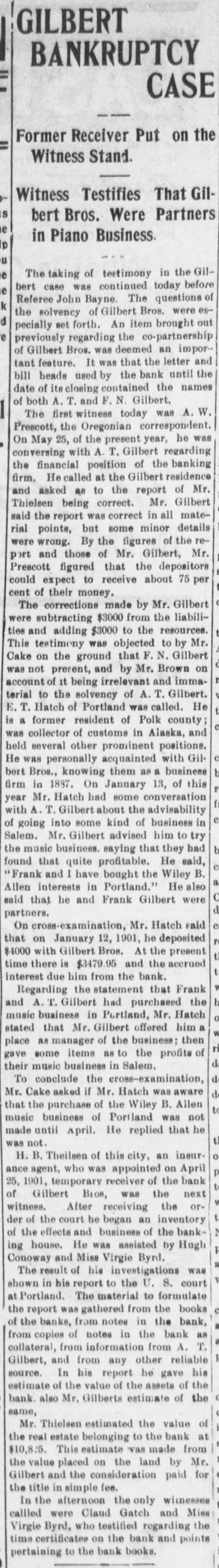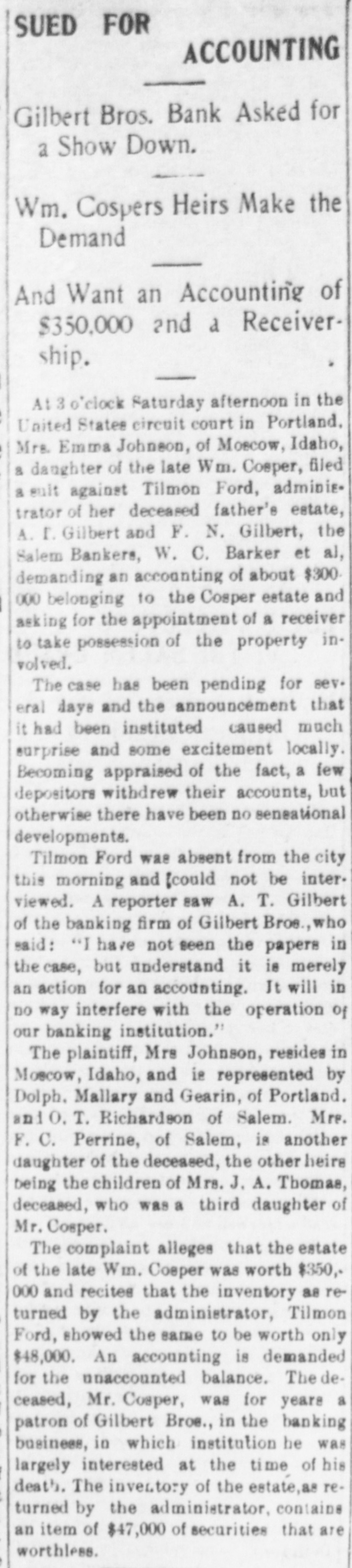 SUED FOR ACCOUNTING Gilbert Bros. Bank Asked for a Show Down. Wm. Cospers Heirs Make the Demand And Want an Accounting of $350,000 and a Receivership. At 3 o'clock Saturday afternoon in the United States circuit court in Portland. Mrs. Emma Johnson, of Moscow, Idaho, & daughter of the late Wm. Cosper, filed & suit against Tilmon Ford, administrator of her deceased father's estate, A. Γ. Gilbert and F. N. Gilbert, the Salem Bankers, W. C. Barker et al, demanding an accounting of about $300. 000 belonging to the Cosper estate and asking for the appointment of a receiver to take possession of the property involved. The case has been pending for sev. eral days and the announcement that it had been instituted caused much surprise and some excitement locally. Becoming appraised of the fact, a few depositors withdrew their accounts, but otherwise there have been no sensational developments. Tilmon Ford was absent from the city this morning and [could not be interviewed. A reporter saw A. T. Gilbert of the banking firm of Gilbert Bros., who said: "I have not seen the papers in the case, but understand it is merely an action for an accounting. It will in no way interfere with the operation of our banking institution." The plaintiff, Mrs Johnson, resides in Moscow, Idaho, and is represented by Dolph. Mallary and Gearin, of Portland. and O. T. Richardson of Salem. Mrs. F. C. Perrine, of Salem, is another daughter of the deceased, the other heire being the children of Mrs. J. A. Thomas, deceased, who was a third daughter of Mr. Cosper. The complaint alleges that the estate of the late Wm. Cosper was worth $350,000 and recites that the inventory as returned by the administrator, Tilmon Ford, showed the same to be worth only $48,000. An accounting is demanded for the unaccounted balance. The ceased, Mr. Cosper, was for years a patron of Gilbert Bros., in the banking business, in which institution he was largely interested at the time of his death. The inventory of the estate,as returned by the administrator, contains an item of $47,000 of securities that are worthless.