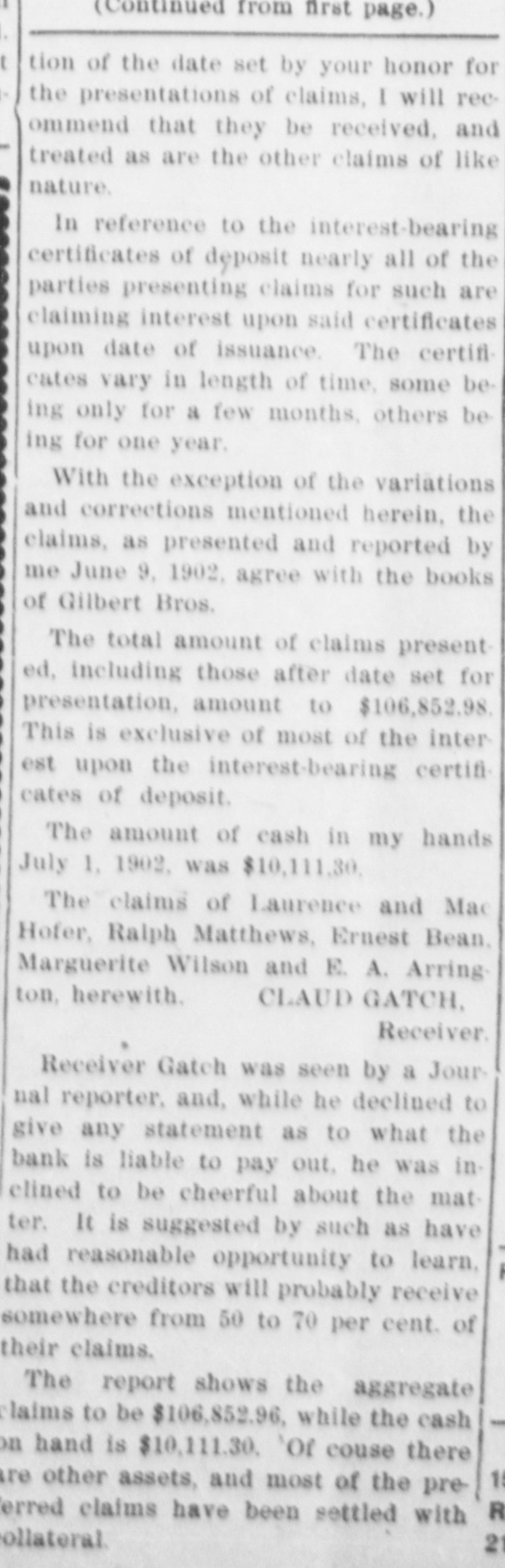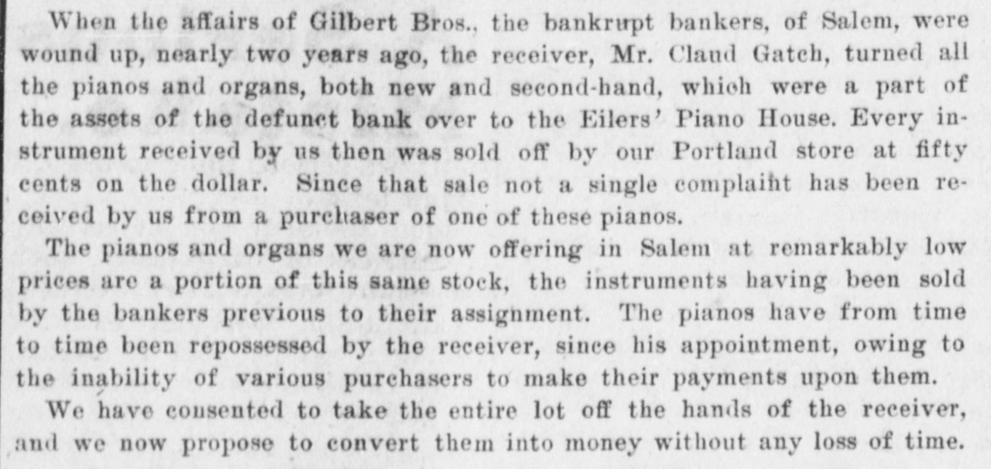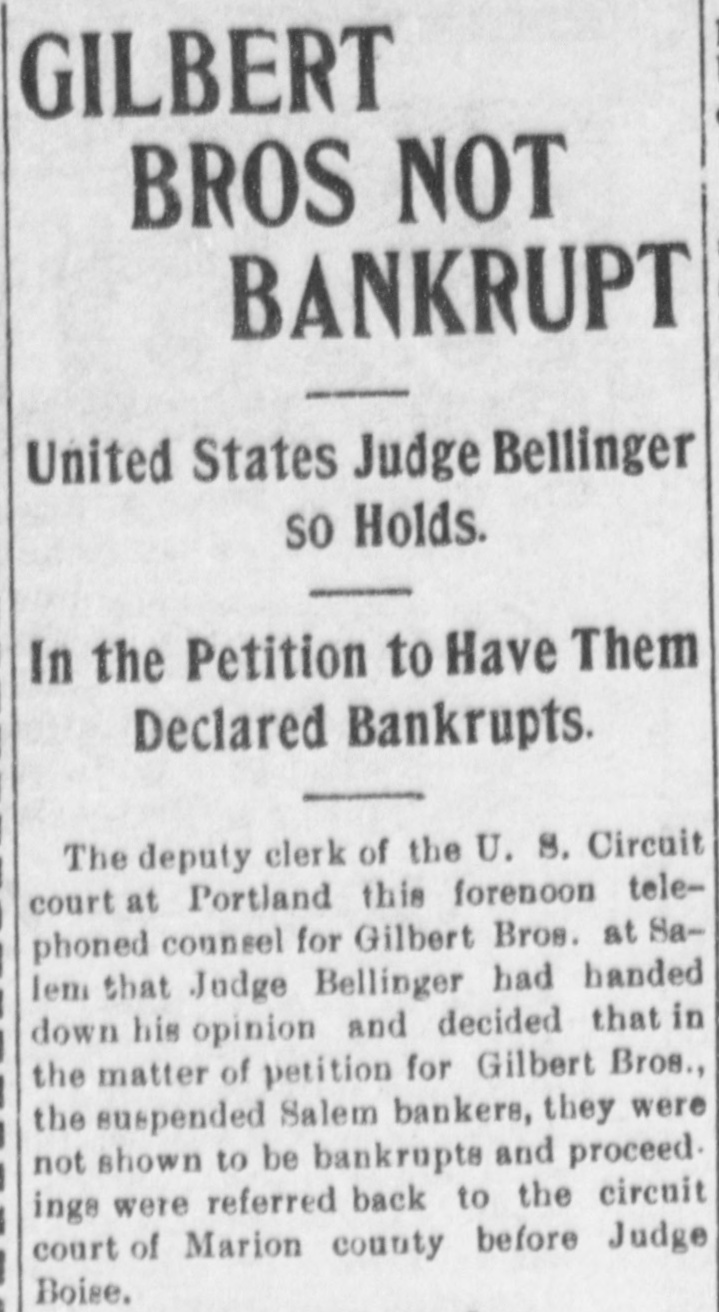 SUED FOR ACCOUNTING Gilbert Bros. Bank Asked for a Show Down. Wm. Cospers Heirs Make the Demand And Want an Accounting of $350,000 and a Receivership. At 3 o'clock Saturday afternoon in the United States circuit court in Portland. Mrs. Emma Johnson, of Moscow, Idaho, & daughter of the late Wm. Cosper, filed & suit against Tilmon Ford, administrator of her deceased father's estate, A. Γ. Gilbert and F. N. Gilbert, the Salem Bankers, W. C. Barker et al, demanding an accounting of about $300. 000 belonging to the Cosper estate and asking for the appointment of a receiver to take possession of the property involved. The case has been pending for sev. eral days and the announcement that it had been instituted caused much surprise and some excitement locally. Becoming appraised of the fact, a few depositors withdrew their accounts, but otherwise there have been no sensational developments. Tilmon Ford was absent from the city this morning and [could not be interviewed. A reporter saw A. T. Gilbert of the banking firm of Gilbert Bros., who said: "I have not seen the papers in the case, but understand it is merely an action for an accounting. It will in no way interfere with the operation of our banking institution." The plaintiff, Mrs Johnson, resides in Moscow, Idaho, and is represented by Dolph. Mallary and Gearin, of Portland. and O. T. Richardson of Salem. Mrs. F. C. Perrine, of Salem, is another daughter of the deceased, the other heire being the children of Mrs. J. A. Thomas, deceased, who was a third daughter of Mr. Cosper. The complaint alleges that the estate of the late Wm. Cosper was worth $350,000 and recites that the inventory as returned by the administrator, Tilmon Ford, showed the same to be worth only $48,000. An accounting is demanded for the unaccounted balance. The ceased, Mr. Cosper, was for years a patron of Gilbert Bros., in the banking business, in which institution he was largely interested at the time of his death. The inventory of the estate,as returned by the administrator, contains an item of $47,000 of securities that are worthless.