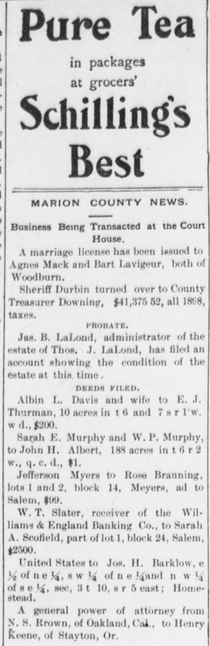 Pure Tea in packages at grocers' Schilling's Best MARION COUNTY NEWS. Business Being Transacted at the Court House. A marriage license has been issued to Agnes Mack and Bart Lavigeur, both of Woodburn. Sheriff Durbin turned over to County Treasurer Downing, $41,375 52, all 1898, taxes. PROBATE. Jas. B. LaLond, administrator of the estate of Thos. J. LaLond, has filed an account showing the condition of the estate at this time. DEEDS FILED. Albin L. Davis and wife to E. J. Thurman, 10 acres in t6 and 7srlw. W d., $200. Sarah E. Murphy and W.P. Murphy, to John H. Albert, 188 acres in t6r2 w., q.c.d., $1. Jefferson Myers to Rose Brauning, lots 1 and 2, block 14, Meyers, ad to Salem, $99. W.T. Slater, receiver of the Williams & England Banking Co., to Sarah A. Scofield, part of lot 1, block 24, Salem, $2500. United States to Jos. H. Barklow, e ½ of n e 1/4, S W 1/4 of n e 1/4and n W 1/4 of 8 e 1/4, sec, 3t 10, S r 5 east; Homestead. A general power of attorney from N.S. Rrown, of Oakland, Cab., to Henry Keene, of Stayton, Or.