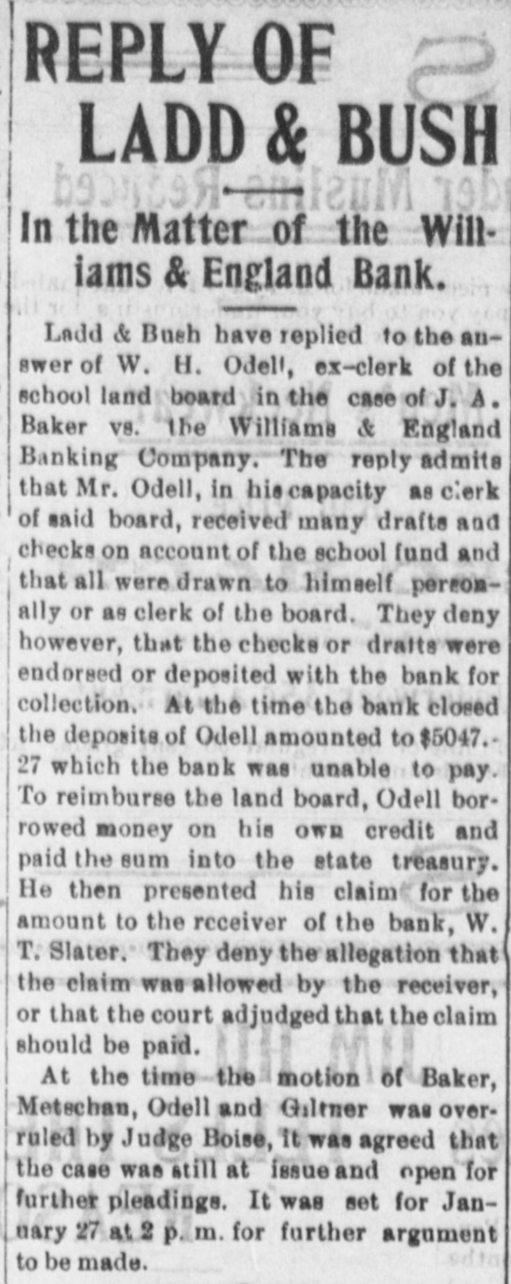 # REPLY OF # LADD & BUSH In the Matter of the Williams & England Bank. Ladd & Bush have replied to the answer of W. H. Odell, ex-clerk of the school land board in the case of J. A. Baker vs. the Williams & England Banking Company. The reply admits that Mr. Odell, in his capacity as clerk of said board, received many drafts and checks on account of the school fund and that all were drawn to himself personally or as clerk of the board. They deny however, that the checks or drafts were endorsed or deposited with the bank for collection. At the time the bank closed the deposits of Odell amounted to $5047.27 which the bank was unable to pay. To reimburse the land board, Odell borrowed money on his own credit and paid the sum into the state treasury. He then presented his claim for the amount to the receiver of the bank, W. T. Slater. They deny the allegation that the claim was allowed by the receiver, or that the court adjudged that the claim should be paid. At the time the motion of Baker, Metechan, Odell and Giltner was overruled by Judge Boise, it was agreed that the case was still at issue and open for further pleadings. It was set for January 27 at 2 p. m. for further argument to be made.