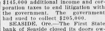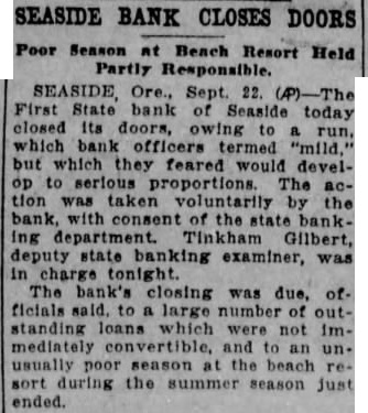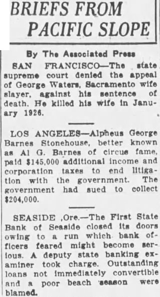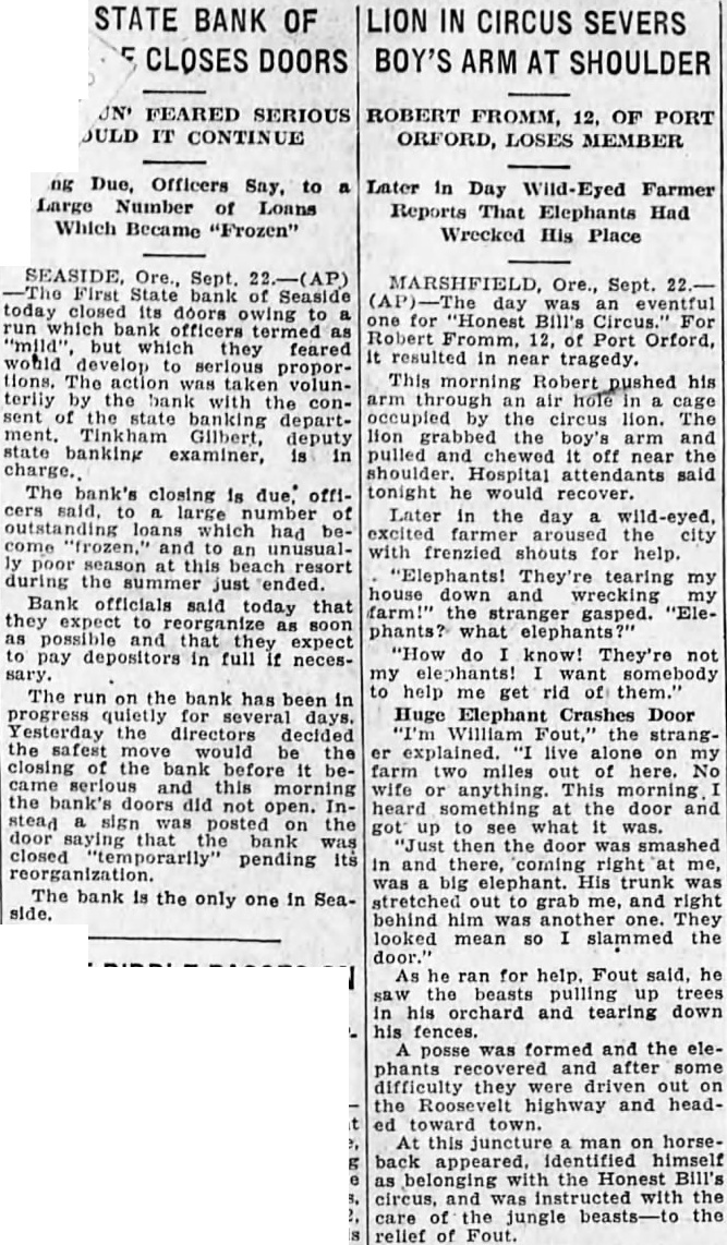 STATE BANK OF LION IN CIRCUS SEVERS CLOSES DOORS BOY'S ARM AT SHOULDER FEARED SERIOUS 0K Due, Officers Say, to Large Number of Loans Which Became "Frozen" Ore., Sept. First State bank today closed doors owing run which officers which they feared would develop serious proportions. The action was taken volunthe conbanking department. Gilbert, deputy state banking examiner, charge. The bank's closing is due, offilarge outstanding loans which had "frozen," and to an unusual season at this resort during the ended. Bank officials said that today possible and that expect pay depositors in full necesThe run the bank has been in quietly days. Yesterday the directors decided the would be the before and this the bank's open. stead was posted on the door saying that bank closed "temporarily" pending reorganization. The bank is the only one in Seaside. ROBERT FROMM, OF PORT ORFORD, LOSES MEMBER Later in Day Farmer Reports That Elephants Had Wrecked His Place MARSHFIELD, Ore., Sept. day was eventful for "Honest Bill's Circus." Robert 12, Port Orford, resulted in near tragedy. This morning his arm air cage by the circus lion. The lion the boy's arm and pulled chewed off near the shoulder. Hospital tonight he would recover. Later in the day wild-eyed, city with frenzied shouts for help. "Elephants! tearing my house down wrecking farm!" stranger gasped. "Elephants? what elephants? "How do know! They're my somebody help rid of them." Huge Elephant Crashes Door William Fout," the strangexplained. live alone on farm miles here. No or anything. This heard the door and got up the door smashed in and there, right me, was big His trunk stretched out grab me, and right behind him was another one. They looked mean so slammed the door. As he ran for help. Fout said, he the beasts trees orchard and tearing down his posse was formed and the elephants after some difficulty they were driven out on the Roosevelt highway and headed toward town. this juncture man on horseback appeared. himself as the Bill's the care of the jungle the relief of Fout.