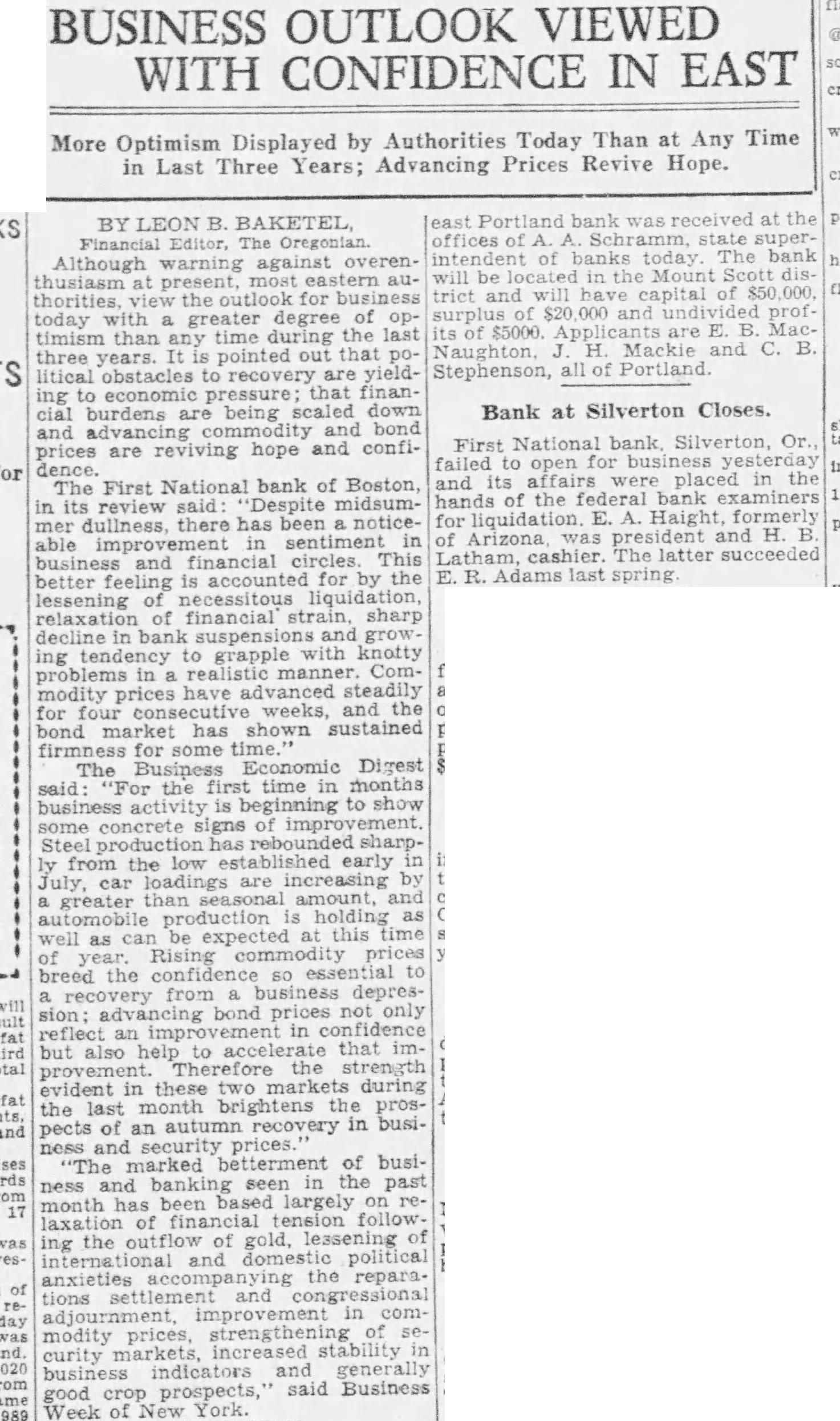 BUSINESS OUTLOOK VIEWED WITH CONFIDENCE IN EAST More Optimism Displayed by Authorities Today Than at Any Time in Last Three Years; Advancing Prices Revive Hope. BY LEON B. BAKETEL Financial Editor, The Oregonian. Although warning against overen. thusiasm at present, most eastern authorities, the for today with greater degree of optimism than any time during the last three years. It is pointed out that political obstacles to recovery are yielding to that finan cial burdens are being scaled down and bond and advancing prices are hope and confidence. The First National bank of Boston in its review Despite midsummer dullness, there has been noticeof able in sentiment in busine and financial circles. This better is accounted for by the lessening of necessitous relaxation of financial strain, sharp decline in suspensions and grow ing to grapple with knotty problems in Commodity prices have vanced steadily for four weeks, and the bond market has shown sustained firmness for some time. The Business Digest said For the first time months is ginning to show some signs of improv Steel production has rebounded sharply from the low established early July, car loadings are increasing by a greater amount automobile production holding as well as be expected at this time Rising prices breed the confidence a recovery from business depression; advancing bond prices not reflect in but also to accelerate that improvement. Therefore the strength evident in these two markets during the last month brightens the prospects of an autumn recovery in busiand security marked betterment of business and banking seen in the past month has been based largely on relaxation of financial tension following the outflow of gold, lessening of international and domestic political anxieties the reparations settlement and adjournment, improvement in commodity prices, strengthening of security markets, increased stability in business indicators and generally said Business good crop prospects, Week of York. east Portland bank was received at the offices of A. Schramm. state super intendent of banks today. The bank will be in the Mount district and will have of $50 000, surplus $20 000 and its of $5000 are E. B. Mac. Naughton, H. Mackie and C. B. Stephenson, all of Portland. Bank at Silverton Closes. First National bank Silverton, Or. for and its affairs were placed in the hands of the federal bank for liquidation E. Haight was and H. B. Arizona Latham, The latter E. R. Adams last spring.
