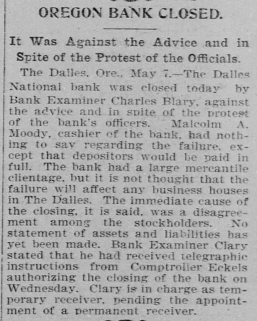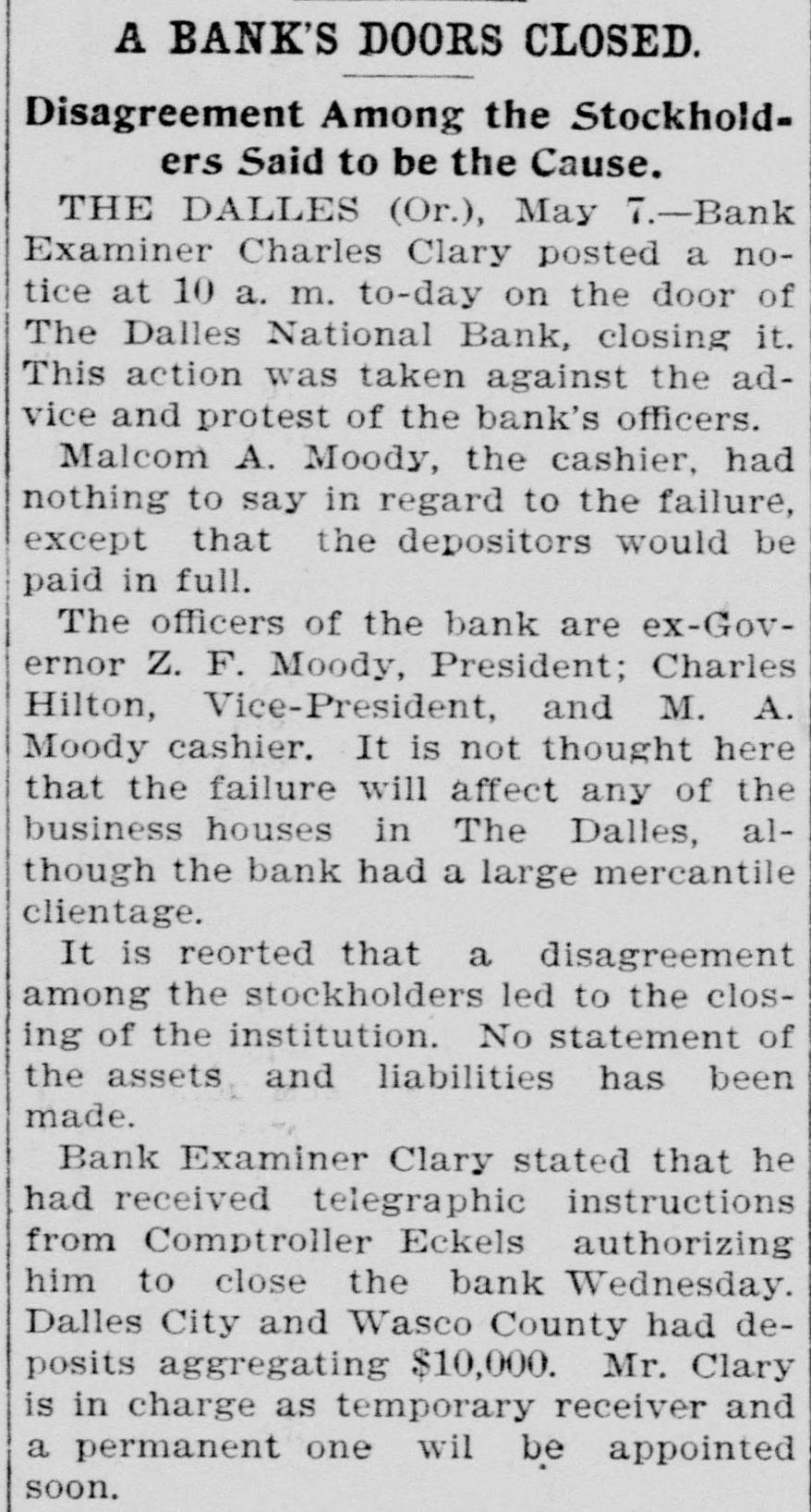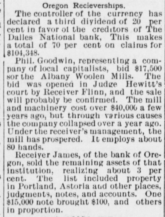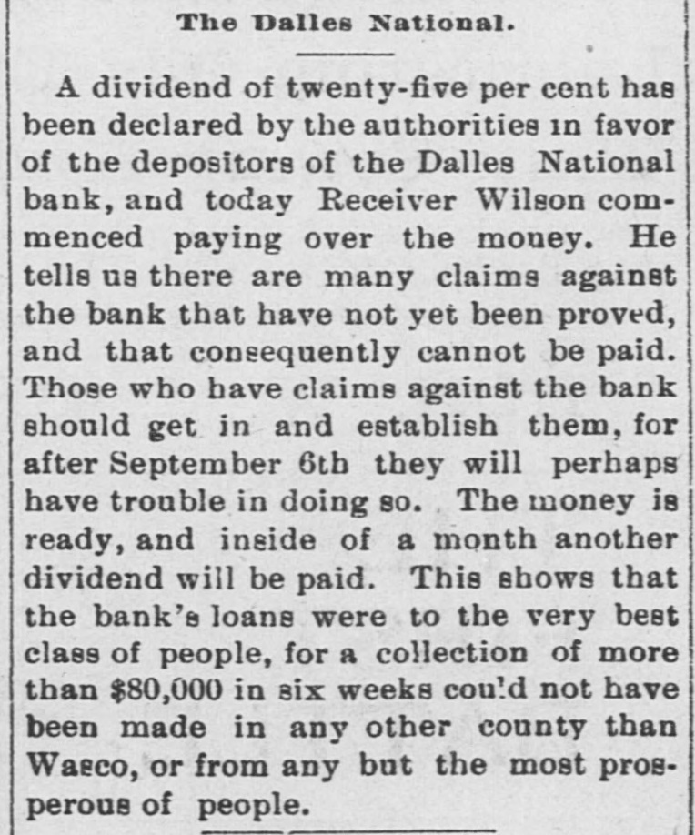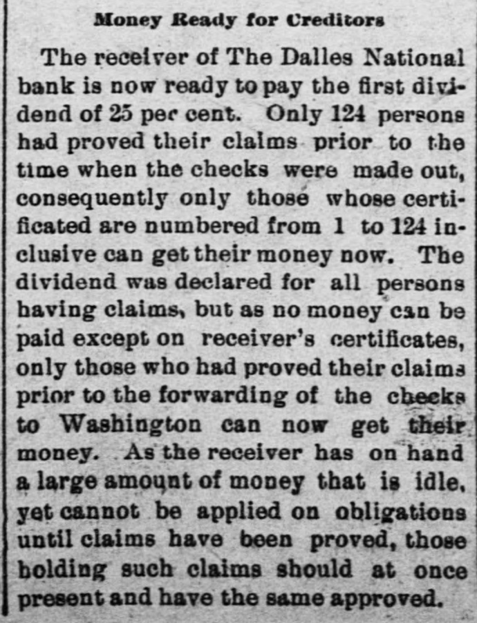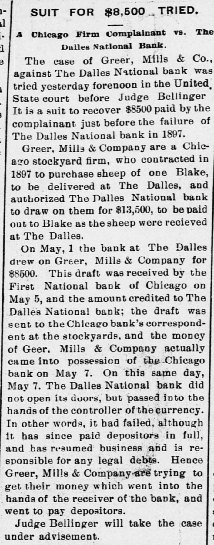 After the jury was sworn in the case of Sprouls vs. the receiver of The Dalles National bank yesterday it was discovered there was a discrepancy between the original complaint and the copy served upon defendant's attorneys, caused by a clerical error, hence the jury was dismissed last evening and the case was continued until next term.