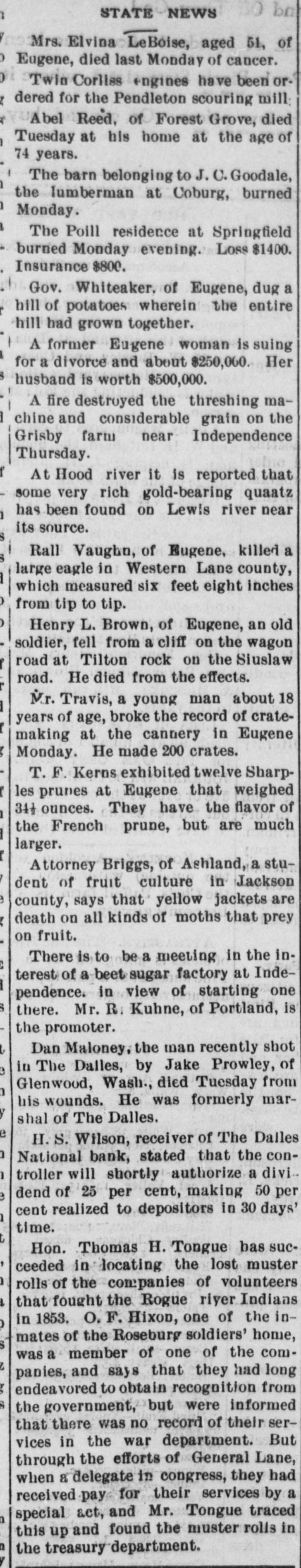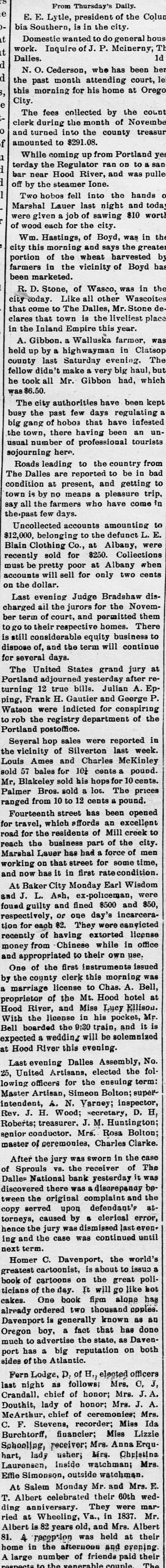 Last evening Dalles Assembly, No. 25, United Artisans, elected the following officers for the ensuing term: Master Artisan, Simeon Bolton; superintendent, A. N. Varney; inspector, Rev. J. H. Wood; secretary, D. H, Roberts; treasurer. J. M. Huntington; senior conductor. Mrs. Rosa Bolton; master of ceremonies, Charles Clarke.