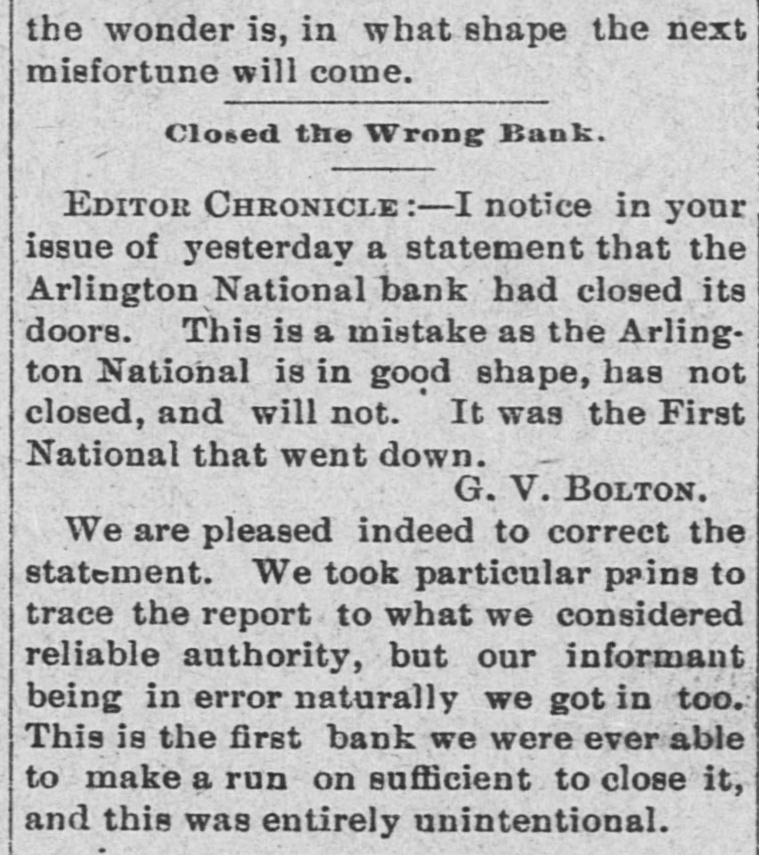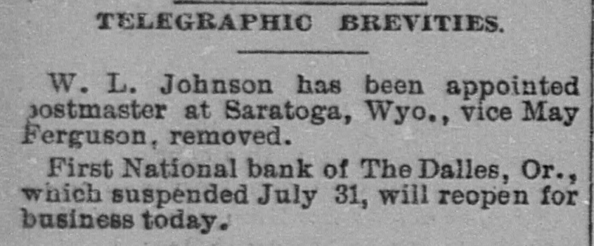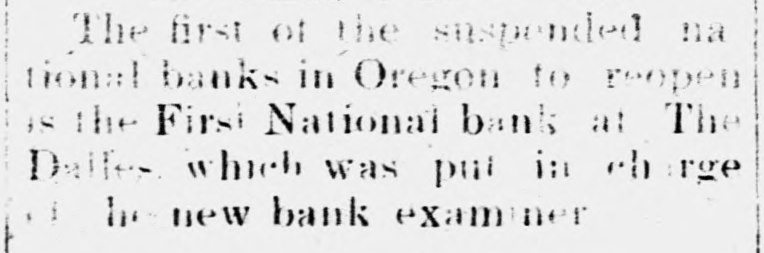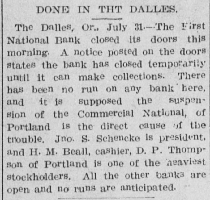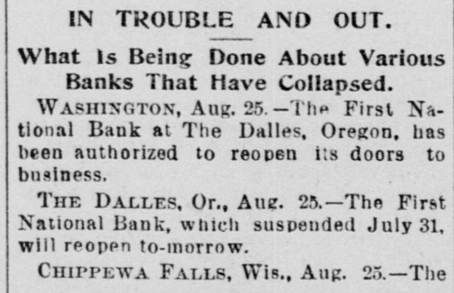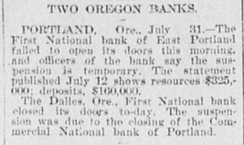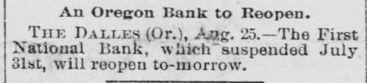 TO PREVENT HOARDING. New York Savings Banks Require the Time Limit. NEW YORK, July 31.-This morning the savings banks of the eit% as a rule, began to take advantage of the sixty-day time classe, where largo amounts are concerned. to check the withdrawal of money for boarding or in senseless fright. but while nearly all the banks claimed the privilege of the time olanse, still in comparatively few instances was is applied. There did not seem to be any run anywhere. In Brooklyn the effect was somewhat different and the notice caused several rans. The greatest was on the Brooklyn Savings bank. When the doors opened this morning an enormous orowd were waiting to draw money. Threats were made. but as these were of no avail the crowd went away in an ugly mood. There were slight rune also on the South Brooklyn Savings institution and the Dime Savings bank. KANSAS CITY, July 31.-The Missouri National bank resumed business this morning, having fully recovered from the effects of the senseless panic which caused its suspension two weeks ago. CEDAR RAPIDS, Iows, July 81.-A. Daniels & Co., private bankers at Marion, have made an assignment. It is believed all will be paid in full and the bank be open in a few days. PORTLAND, Ore., July 81.-The First National bank of East Portland failed. Officers say the suspension is temporary. Resources, July 12, $325,000, deposits $160,000. AKRON, O., July 31.-The Akron Savings bank went into the hands of a receiver this morning. Capital $200,000, reserve $50,000, surplus $18,000. Will pay in full. THE DALLES, Ore., July 31.-The First National bank failed this morning, due to closing of the Commercial National bank of Portland. HORNELLSVILLE, N. Y., July 81.-N. M. Craneland, a private banker, failed this morning. Assets ar said to exceed liabilities. SPRINGFIELD, Mo., July 31.-The Springfield Savings bank failed this morning. Deposits $100,00. capital $25,000; will pay in full. PENDLETON, Ore.. July 31.-The Pendleton Savinge bank has temporarily suspended. Assets $250.000, liabilities $135,000. ASHLAND. Wis., July 1.-The First National bank failed this morning, owing to the steady drain on deposits.