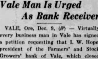 Vale Man Is Urged As Bank Receiver VALE, Ore, Dec. 9. (AP) Virtually every business man in Vale has signed a petition requesting that I. W. Hope, president of the Farmers' and Stock Growers' bank of Vale, which closed