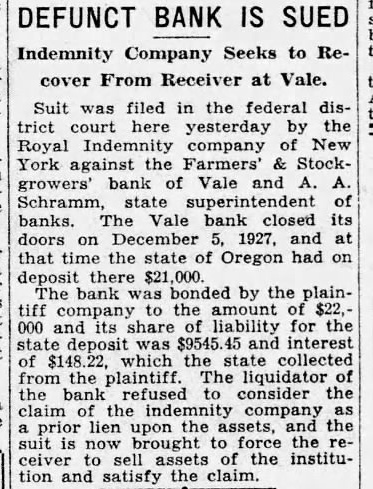 DEFUNCT BANK IS SUED Indemnity Company Seeks to Recover From Receiver at Vale. Suit was filed in the federal district court here yesterday by the Royal company of New York against the Farmers' Stockof Vale and Schramm, banks. Vale bank closed doors on December 1927, and at that time the state of Oregon had on deposit there The bank bonded by the plaintiff company to the amount of $22, 000 and its share liability for the state deposit was $9545. interest of which the state collected from the plaintiff. The liquidator refused consider the claim the indemnity company prior lien upon the assets, and the suit is now brought to force the ceiver to assets of the institution and satisfy the claim.