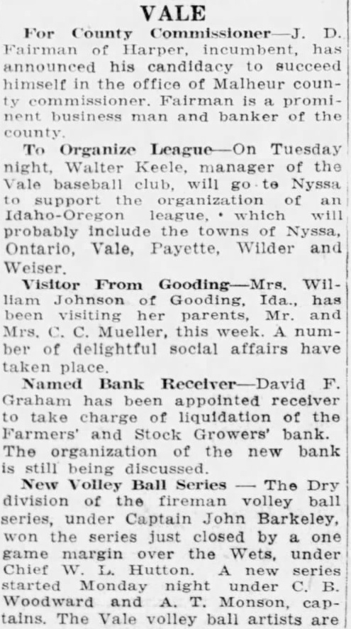 VALE For County Commissioner-J D. Fairman Harper, incumbent, has announced his candidacy to succeed himself in the office of Malheur county commissioner Fairman is a prominent business man and banker of the county To Organize League-On Tuesday night, Walter Keele, manager of the Vale baseball club, will go to Nyssa support the organization of an Idaho-Oregon league, which will probably include the towns of Nyssa, Ontario, Vale, Payette, Wilder and Weiser. Visitor From Gooding-Mrs. William Johnson of Gooding, Ida., has been visiting her parents, Mr. and Mrs. Mueller, this week A number of delightful social affairs have taken place Named Bank Receiver- F. Graham has been appointed receiver to take charge of liquidation of the Farmers' and Stock Growers' bank. The organization of the new bank is still being New Volley Ball Series The Dry division of the fireman volley ball series, under Captain John Barkeley, won the series just closed by one game margin over the Wets, under Chief Hutton. A new series started Monday night under C. B. Woodward and A. Monson, captains. The Vale volley ball artists are