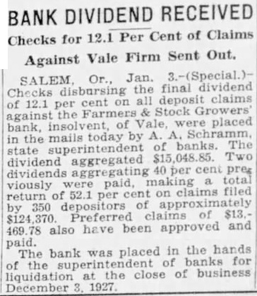 BANK DIVIDEND RECEIVED Checks for 12.1 Per Cent of Claims Against Vale Firm Sent Out. Jan. 3.-(Special. SALEM Or. disbursing the final dividend 12.1 per cent on all deposit claims against Farmers Stock Growers bank, insolvent of Vale placed in the mails today by Schramm state superintendent of banks. The dividend aggregated Two dividends aggregating 40 per cent total pre paid, making return viously of 52.1 per on claims filed 350 depositors Preferred $13.469 also have been approved and paid. The bank was placed in the hands of the superintendent of banks liquidation close of business December