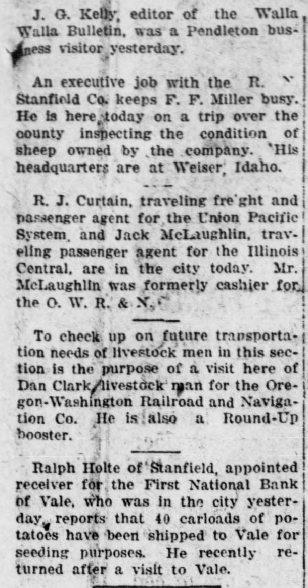 J. G. Kelly, editor of the Walla Walla Bulletin, was a Pendleton business visitor yesterday. An executive job with the R. Stanfield Co. keeps F. F. Miller busy. He is here today on a trip over the county inspecting the condition of sheep owned by the company. His headquarters are at Weiser, Idaho. R. J. Curtain, traveling freight and passenger agent for the Union Pacific System, and Jack McLaughlin, traveling passenger agent for the Illinois Central, are in the city today. Mr. McLaughlin was formerly cashier for the O. W. R. & N. To check up on future transportation needs of livestock men in this section is the purpose of a visit here of Dan Clark livestock man for the Oregon-Washington Railroad and Navigation Co. He is also a Round-Up booster. Ralph Holte of Stanfield, appointed receiver for the First National Bank of Vale, who was in the city yesterday, reports that 40 carloads of potatoes have been shipped to Vale for seeding purposes. He recently returned after a visit to Vale.