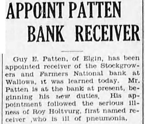 APPOINT PATTEN BANK RECEIVER Guy E. Patten. of Elgin, has been appointed receiver of the Stockgrowers and Farmers National bank at Wallowa, it was learned today. Mr. Patten is at the bank at present, beginning his new duties His appointment followed the serious 111ness of Roy Holtvurg. first named recelver who is 111 of pneumonia.