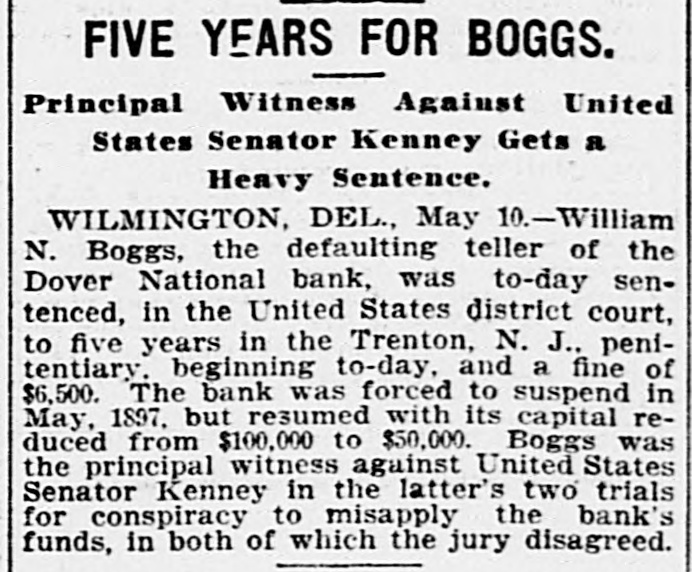 BONDSMEN TO SUFFER. Judgment Against Personal Friends of the Teller. BANK READY TO MEET DEMANDS WHARTON DENIES THAT HE IS WITHDRAWING HIS MONEY. WARRANT FOR BOGGS NOW IN THE U. S. MARSHAL'S HANDS. Dover, June 8.--The First National Bank opened as usual this morning, prepared to meet a run, but the run did ) not occur. The Farmers' Bank here has pledged assistance,as has also the National Bank of Philadelphia, through which the First National of Dover transacts its business. Sheriff Shaw has issued execution against former sureties of William N. Boggs, the defaulting paying-teller of the First National Bank, as follows: George V. Massey, John M. Moore, A. H, Moore, Dr. John M. Smith, James Boggs and Joseph R. Whitaker (estate.) This bond was entered December 3, 1891, and was for $10,000. While no definite statement of the amount of Boggs' defalcation is given out by the officers of the bank, it is now known in financial circles that it will exceed $100,000. At 10.30 o'clock a run was threatened, but President Richardson succeeded in assuring most of the depositors that there was no necessity for anxiety and they departed. The directors since Saturday have deposited over $150,000 as an evidence of their faith in the institution. President Richardson announced that he would back the bank to his last dollar. Of the defalcation it is probable that at least half of it will have to come out of the bank's capital, which is $100,000. The par value of the stock, is $100 a share, but it has been selling recently at $148. The bank's surplus, according to the last statement, was about $38,000. This is wiped out by the defalcation. The bond for Boggs, given by the American Surety Company, amounts to $10,000, which makes a total of $48,000 applicable to the shortage. There is a probability of the other sureties, amounting to $10,000, given by Boggs in previous years, being available, but their liability is a question to be legally determined. A few fruit growers and some wage 1 workers besieged the bank shortly before opening time this morning and S withdrew their deposits. None of the large depositors, however, were in the least alarmed over the stability of the institution and deposited their money as usual. At the close of business hours one of the directors announced that the amount of the deposits exceeded the withdrawals. Samuel Wharton, one of the directors, has written an open letter denying that he has been drawing his money out of the bank since the Boggs t. defalcation came to light. The warrant for Boggs' arrest has ). been sworn out in Wilmington and placed in the hands of Marshal Lan nan. e No clue to Boggs has yet been r found.