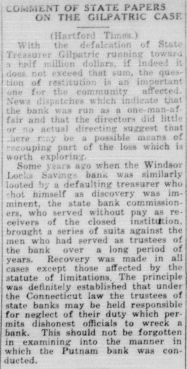 COMMENT OF STATE PAPERS ON THE GILPATRIC CASE (Hartford Times.) With the defalcation of State Treasurer Gilpatric running toward a half million dollars, if indeed it does not exceed that sum, the question of restitution is an important one for the community affected. News dispatches which indicate that the bank was run as a one-man-affair and that the directors did little or no actual directing suggest that there may be a possible means of recouping part of the loss which is worth exploring. Some years ago when the Windsor Locks Savings bank was similarly looted by a defaulting treasurer who shot himself as discovery was imminent, the state bank commissioners, who served without pay as receivers of the closed institution, brought a series of suits against the men who had served as trustees of the bank over a long period of years. Recovery was made in all cases except those affected by the statute of limitations, The principle was definitely established that under the Connecticut law the trustees of state banks may be held responsible for neglect of their duty which permits dishonest officials to wreck a bank. This should not be forgotten in examining into the manner in which the Putnam bank was conducted.