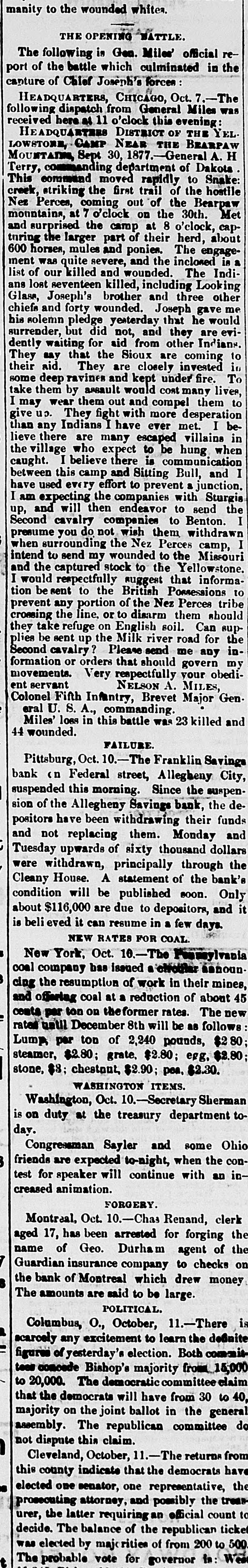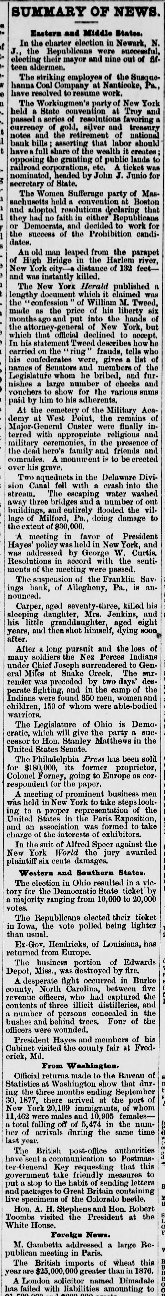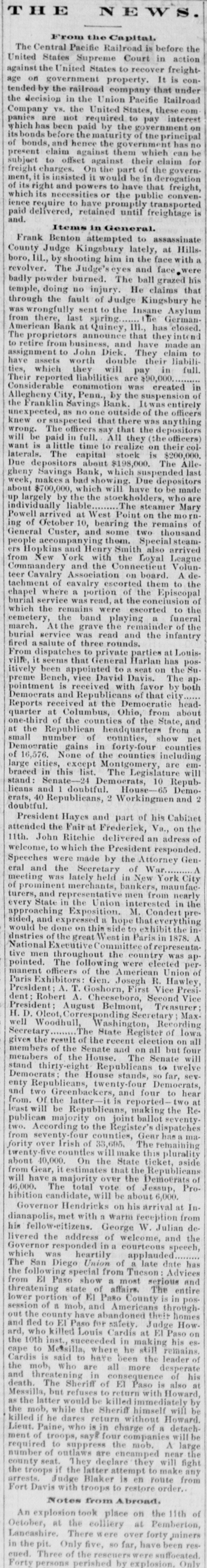 THE NEWS. From the Capital. The Central Pacific Railroad is before the United States Supreme Court in action against the United States to recover freight age on government property. It is con tended by the railroad company that under the decision in the Union Pacific Railroad Company VS. the United States, these com panies are not required to pay interes which has been paid by the government 01 its bonds before the maturity of the principa of bonds, and hence the government has no present claim against them which can be subject to offset against their claim fo freight charges. On the part of the govern ment, it is insisted it would be in derogation of its right and powers to have that freight which its necessities or the public conven ience require to have promptly transporte and. paid delivered, retained until freightage i Items in General. Frank Benton attempted to assassinate County Judge Kingsbury lately, at Hills boro, III., by shooting him in the face with revolver. The Judge's eyes and face were badly powder burned. The ball grazed hi temple, doing no injury. He claims tha through the fault of Judge Kingsbury h was wrongfully sent to the Insane Asylun from there, last spring the German American Bank at Quincy, III., has closed The proprietors announce that they inten to retire from business, and have made an assignment to John Dick. They claim to have assets worth double their liabili ties, which they will pay in full Their reported liabilities are $90,000. Considerable commotion was created in Allegheny City, Penn., by the suspension o the Franklin Savings Bank. Itwas entirely unexpected, as no one outside of the officer knew or suspected that there was anything wrong. The officers say that the depositor will be paid in full. All they (the officers want is a little time to realize on their col laterals. The capital stock is $200,000 Due depositors about $198,000. The Alle gheny Savings Bank, which suspended las week, makes a bad showing. Due depositor about $700,000, which will have to be made up largely by the the stockholders, who are individually liable The steamer Mary Powell arrived at West Point on the mo rn ing of October 10, bearing the remains o General Custer, and some two thousand people accompanying them. Special steam ers Hopkins and Henry Smith also arrive from New York with the Loyal League Commandery and the Connecticut Volun teer Cavalry Association on board. A de tachment of cavalry escorted them to the chapel where a portion of the Episcopa burial service was read, at the conclusion o which the remains were escorted to the cemetery, the band playing a funera march. At the grave the remainder of the burial service was read and the infantry fired a salute of three rounds. From dispatches to private parties at Louis ville, it seems that General Harlan has pos itively been appointed to a seat on the Su preme Bench, vice David Davis. The ap pointment is received with favor by both Democrats and Republicans of that city Reports received at the Democratic head quarter at Columbus, Ohio, from about one-third of the counties of the State, and at the Republican headquarters from : small number of counties, show ne Demogratic gains in forty-four counties of 16,576. None of the counties including large cities, except Montgomery, are em braced in this list. The Legislature will stand: Senate-24 Democrats, 10 Repub licans and 1 doubtful. House-65 Demo erats, doubtful. 40 Republicans, 2 Workingmen and : President Hayes and part of his Cabine attended the Fair at Frederick, Va., on the 11th. John Ritchie delivered an adress o welcome, to which the President responded Speeches were made by the Attorney Gen eral and the Secretary of War. meeting was lately held in New York City of prominent merchants, bankers, maunfac turers, and representative men from nearly every State in the Union interested in the approaching Exposition. M. Condert pre sided, and expressed a hope that everything would be done on this side to exhibit the in dnstries of the great West in Paris in 1878. / National Executive Committee of representa tive men throughout the country was ap pointed. The following were elected per manent officers of the American Union o Paris Exhibitors: Gen. Josegh R. Hawley Presldent: A. T. Goshorn, First Vice Presi dent; Robert A. Cheeseboro, Second Vic President; August Belmont, Treasurer H. D. Olcot, Corresponding Secretary Max well Woodhull, Washington, Recording Secretary The State Register of low: gives the result of the recent election on al members of the Senate and on all but fou members of the House. The Senate wil stand thirty-eight Republicans to twelve Democrats: the House stands, 80 far, sev enty Republicans, twenty-four Democrats and two Greenbackers, and four to hear from. Of the latter-it is reported-two a least will be Republicans, making the Re publican majority on joint ballot seventy two. According to the Register's dispatches from seventy-four counties, Gear has a ma fority over Irish of 33,695. The remaining twenty-five countles will make this plurality about 10,000. On the State ticket, aside from Gear, it estimates that the Republicans will have a majority over the Democrats 0 46,000. The total vote of Jessup, Pro hibition candidate, will be about 6,000. Governor Hendricks on his arrival at In dianapolis, met with n warm reception from his fellow-citizens. George W. Julian de livered the address of welcome, and the Governor responded in a courteous speech which was heartily applauded