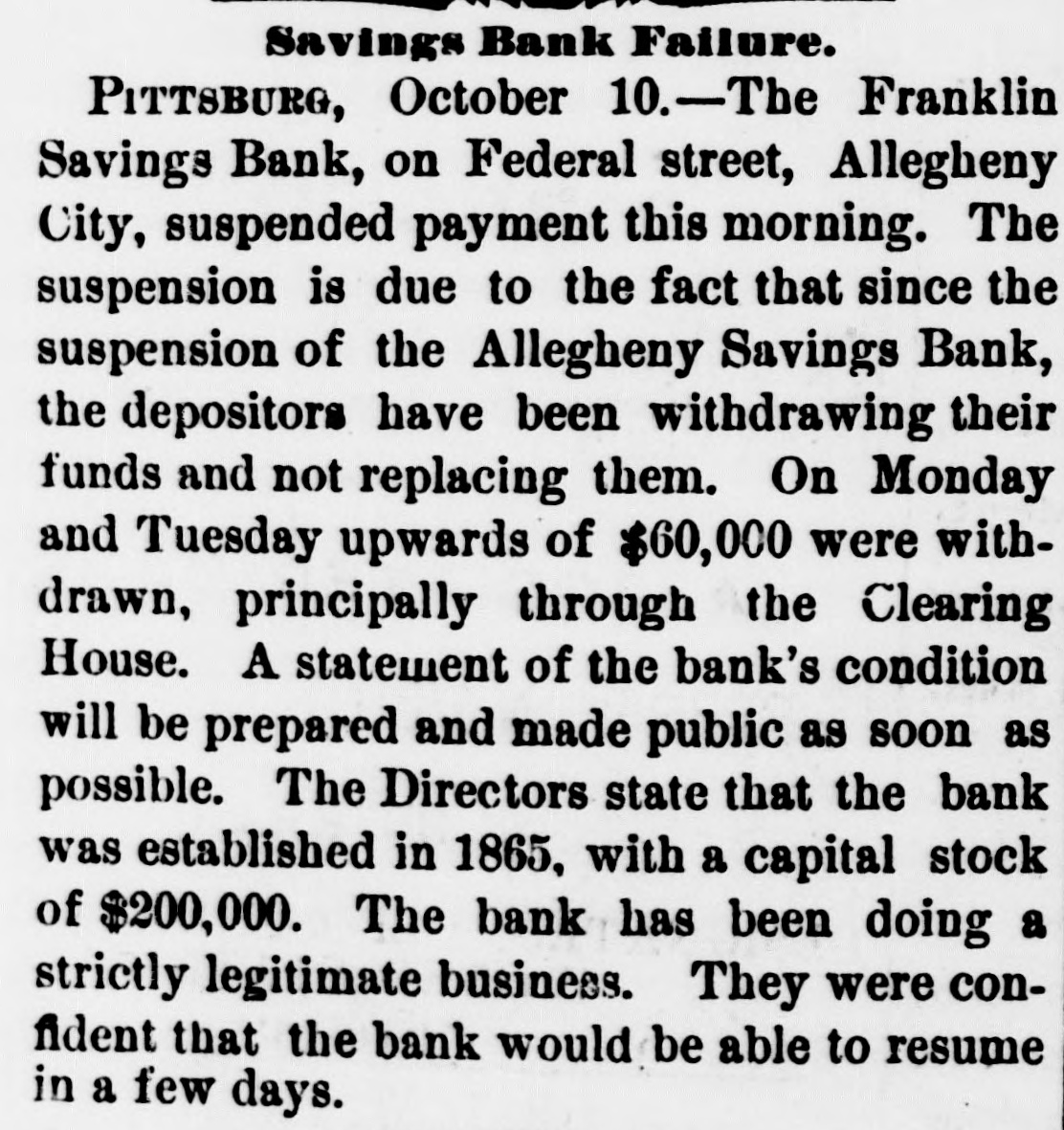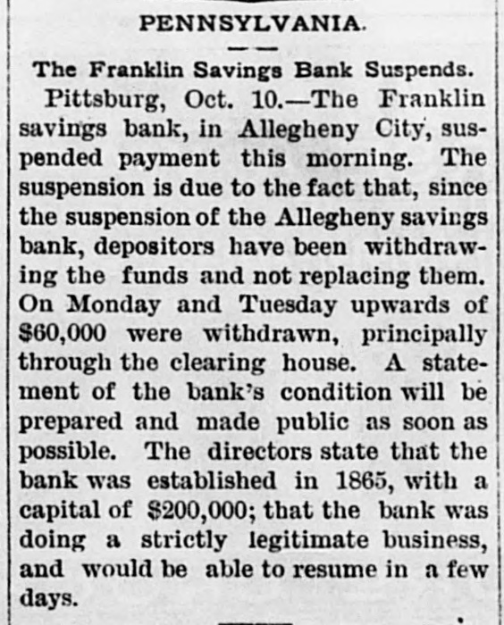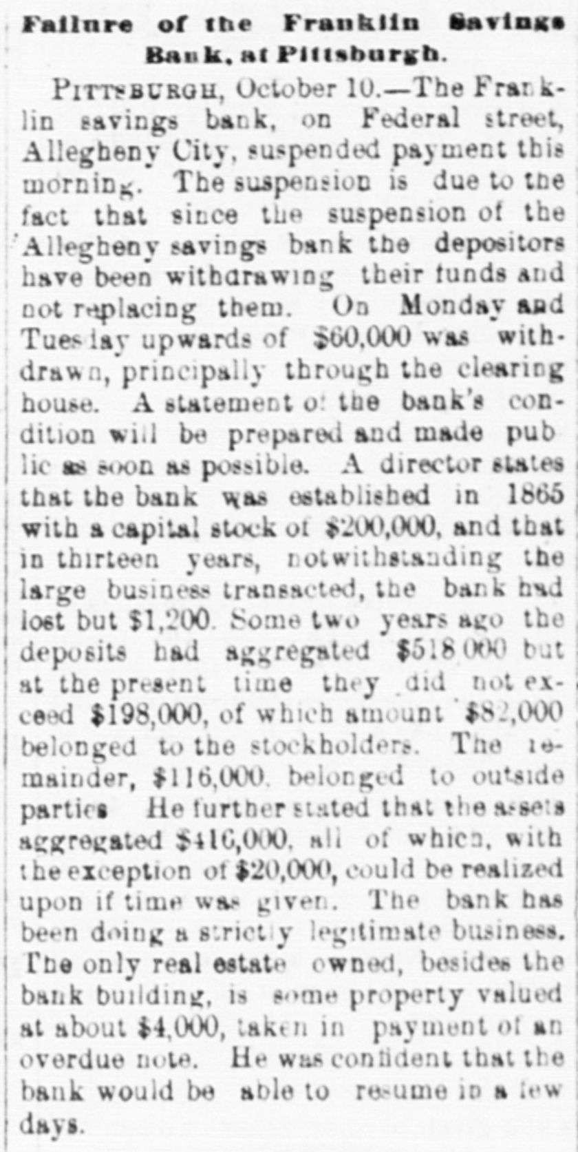 THE NEWS. From the Capital. The Central Pacific Railroad is before the United States Supreme Court in action against the United States to recover freight age on government property. It is con tended by the railroad company that under the decision in the Union Pacific Railroad Company VS. the United States, these com panies are not required to pay interes which has been paid by the government 01 its bonds before the maturity of the principa of bonds, and hence the government has no present claim against them which can be subject to offset against their claim fo freight charges. On the part of the govern ment, it is insisted it would be in derogation of its right and powers to have that freight which its necessities or the public conven ience require to have promptly transporte and. paid delivered, retained until freightage i Items in General. Frank Benton attempted to assassinate County Judge Kingsbury lately, at Hills boro, III., by shooting him in the face with revolver. The Judge's eyes and face were badly powder burned. The ball grazed hi temple, doing no injury. He claims tha through the fault of Judge Kingsbury h was wrongfully sent to the Insane Asylun from there, last spring the German American Bank at Quincy, III., has closed The proprietors announce that they inten to retire from business, and have made an assignment to John Dick. They claim to have assets worth double their liabili ties, which they will pay in full Their reported liabilities are $90,000. Considerable commotion was created in Allegheny City, Penn., by the suspension o the Franklin Savings Bank. Itwas entirely unexpected, as no one outside of the officer knew or suspected that there was anything wrong. The officers say that the depositor will be paid in full. All they (the officers want is a little time to realize on their col laterals. The capital stock is $200,000 Due depositors about $198,000. The Alle gheny Savings Bank, which suspended las week, makes a bad showing. Due depositor about $700,000, which will have to be made up largely by the the stockholders, who are individually liable The steamer Mary Powell arrived at West Point on the mo rn ing of October 10, bearing the remains o General Custer, and some two thousand people accompanying them. Special steam ers Hopkins and Henry Smith also arrive from New York with the Loyal League Commandery and the Connecticut Volun teer Cavalry Association on board. A de tachment of cavalry escorted them to the chapel where a portion of the Episcopa burial service was read, at the conclusion o which the remains were escorted to the cemetery, the band playing a funera march. At the grave the remainder of the burial service was read and the infantry fired a salute of three rounds. From dispatches to private parties at Louis ville, it seems that General Harlan has pos itively been appointed to a seat on the Su preme Bench, vice David Davis. The ap pointment is received with favor by both Democrats and Republicans of that city Reports received at the Democratic head quarter at Columbus, Ohio, from about one-third of the counties of the State, and at the Republican headquarters from : small number of counties, show ne Demogratic gains in forty-four counties of 16,576. None of the counties including large cities, except Montgomery, are em braced in this list. The Legislature will stand: Senate-24 Democrats, 10 Repub licans and 1 doubtful. House-65 Demo erats, doubtful. 40 Republicans, 2 Workingmen and : President Hayes and part of his Cabine attended the Fair at Frederick, Va., on the 11th. John Ritchie delivered an adress o welcome, to which the President responded Speeches were made by the Attorney Gen eral and the Secretary of War. meeting was lately held in New York City of prominent merchants, bankers, maunfac turers, and representative men from nearly every State in the Union interested in the approaching Exposition. M. Condert pre sided, and expressed a hope that everything would be done on this side to exhibit the in dnstries of the great West in Paris in 1878. / National Executive Committee of representa tive men throughout the country was ap pointed. The following were elected per manent officers of the American Union o Paris Exhibitors: Gen. Josegh R. Hawley Presldent: A. T. Goshorn, First Vice Presi dent; Robert A. Cheeseboro, Second Vic President; August Belmont, Treasurer H. D. Olcot, Corresponding Secretary Max well Woodhull, Washington, Recording Secretary The State Register of low: gives the result of the recent election on al members of the Senate and on all but fou members of the House. The Senate wil stand thirty-eight Republicans to twelve Democrats: the House stands, 80 far, sev enty Republicans, twenty-four Democrats and two Greenbackers, and four to hear from. Of the latter-it is reported-two a least will be Republicans, making the Re publican majority on joint ballot seventy two. According to the Register's dispatches from seventy-four counties, Gear has a ma fority over Irish of 33,695. The remaining twenty-five countles will make this plurality about 10,000. On the State ticket, aside from Gear, it estimates that the Republicans will have a majority over the Democrats 0 46,000. The total vote of Jessup, Pro hibition candidate, will be about 6,000. Governor Hendricks on his arrival at In dianapolis, met with n warm reception from his fellow-citizens. George W. Julian de livered the address of welcome, and the Governor responded in a courteous speech which was heartily applauded
