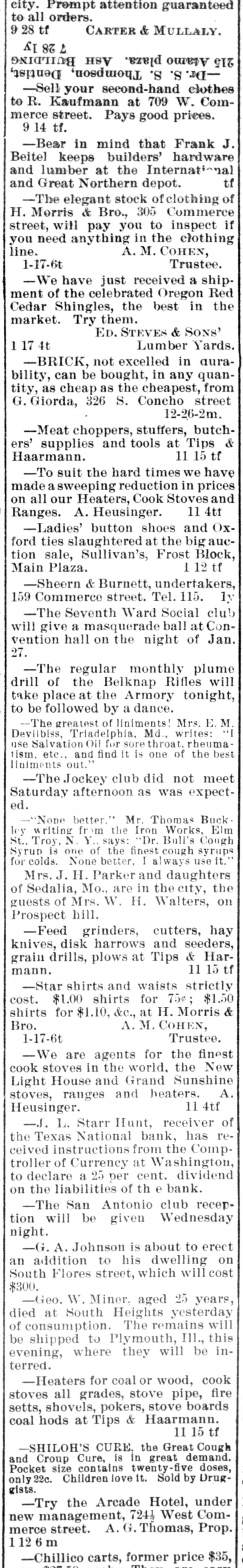 city. Prompt attention guaranteed to all orders. 9 28 tf CARTER & MULLALY. SI % 2 215 Atamo plaza. ASH BUILDING -Dr. S. S. Thompson, Dentist, -Sell your second-hand clothes to R. Kaufmann at 709 W. Commerce street. Pays good prices. 9 14 tf. -Bear in mind that Frank J. Beitel keeps builders' hardware and lumber at the International tf and Great Northern depot. -The elegant stock of clothing of H. Morris & Bro., 305 Commerce street, will pay you to inspect if you need anything in the clothing line. A. M. COHEN, Trustee. 1-17-6t -We have just received a shipment of the celebrated Oregon Red Cedar Shingles, the best in the market. Try them. ED. STEVES & SONS' Lumber Yards. 1 17 4t -BRICK, not excelled in aurability, can be bought, in any quantity, as cheap as the cheapest, from G. Giorda, 326 S. Concho street 12-26-2m. -Meat choppers, stuffers, butchers' supplies and tools at Tips & 11 15 tf Haarmann. -To suit the hard times we have made a sweeping reduction in prices on all our Heaters, Cook Stoves and Ranges. A. Heusinger. 11 4th -Ladies' button shoes and Oxford ties slaughtered at the big auction sale, Sullivan's, Frost Block, 1 12 tf Main Plaza. -Sheern & Burnett, undertakers, 159 Commerce street. Tel. 115. 1y -The Seventh Ward Social club will give a masquerade ball at Convention hall on the night of Jan. 27. -The regular monthly plume drill of the Belknap Rifles will take place at the Armory tonight, to be followed by a dance. -The greatest of liniments! Mrs. E. M. Devilbiss, Triadelphia, Md., writes: "I use Salvation Oil for sore throat. rheumatism, etc., and find it is one of the best liniments out." -The Jockey club did not meet Saturday afternoon as was expected. -"None better." Mr. Thomas Buck. ley writing from the Iron Works, Elm St., Troy, N. Y.. says: "Dr. Bull's Cough Syrup is one of the finest cough syrups for colds. None better, I always use it. Mrs. J. H. Parker and daughters of Sedalia, Mo., are in the city, the guests of Mrs. W. H. Walters, on Prospect hill. -Feed grinders, cutters, hay knives, disk harrows and seeders, grain drills, plows at Tips & Har11 15 tf mann. -Star shirts and waists strictly cost. $1.00 shirts for 75e; $1.50 shirts for $1.10, &c., at H. Morris & Bro. A. M. COHEN, Trustee. 1-17-6t -We are agents for the finest cook stoves in the world. the New Light House and Grand Sunshine stoves, ranges and heaters. A. 11 4tf Heusinger. -.1. L. Starr Hunt, receiver of the Texas National bank, has received instructions from the Comptroller of Currency at Washington, to declare a 25 per cent. dividend on the liabilities of th e bank. -The San Antonio club reception will be given Wednesday night. -G. A. Johnson is about to erect an addition to his dwelling on South Flores street, which will cost $300. -Geo. W. Miner. aged 25 years, died at South Heights yesterday of consumption. The remains will be shipped to Plymouth, III., this evening, where they will be interred. -Heaters for coal or wood, cook stoves all grades, stove pipe, fire setts, shovels, pokers, stove boards coal hods at Tips & Haarmann. 11 15 tf -SHILOH'S CURE, the Great Cough and Croup Cure, is in great demand. Pocket size contains twenty-five doses, only 22c. Children love it. Sold by Druggists. -Try the Arcade Hotel, under new management, 7241 West Commerce street. A. G. Thomas, Prop. 1126m -Chillico carts, former price $35,