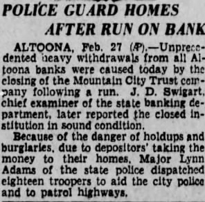 POLICE GUARD HOMES AFTER RUN ON BANK ALTOONA Feb. 27 Unprecedented heavy withdrawals from all Altoona banks were caused today by the closing the Mountain City Trust ceinpany following run. D. Swigart. chief examiner of the state banking department. later reported the closed institution Because of the danger of holdups and burglaries. due depositors' taking the money to their homes, Major Lynn Adams of the state police dispatched eighteen aid the city police and to patrol highways.