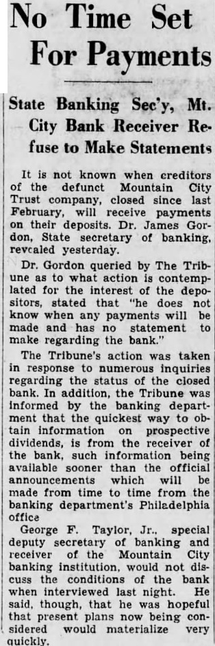 No Time Set For Payments State Banking Sec'y, Mt. City Bank Receiver Refuse to Make Statements not known when creditors the defunct Trust company, closed since will receive payments on their deposits. Dr. James Gordon, secretary of banking. yesterday. Dr. Gordon queried by The Tribaction lated for the the sitors, stated that does not when any will made and has statement regarding the bank. The Tribune's action was taken in response to numerous inquiries regarding the status the closed bank. In the by the banking department that the quickest way tain prospective from the receiver the bank, such being available sooner than the official which will made from time to from the banking department's Philadelphia office George special deputy banking and receiver Mountain banking institution. would not discuss conditions the bank when interviewed last night. said, though, that he hopeful that now being sidered would materialize very quickly.