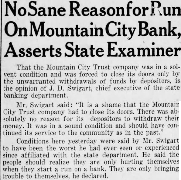 That the Mountain City Trust company was in solvent condition and was forced to close its doors only by the unwarranted withdrawals of funds by depositors, is the opinion of Swigart, chief executive of the state banking department. Mr. Swigart said: is a shame that the Mountain City Trust company had to close its doors. There was solutely no reason for its depositors to withdraw their It was in sound condition and should have conmoney. tinued its service to the community as in the past." Conditions here yesterday were said by Mr. Swigart to have been the worst he had ever seen or experienced since affiliated with the state department. He said the should realize they only hurting themselves people are when they start on bank. They are only bringing trouble to themselves, he declared.