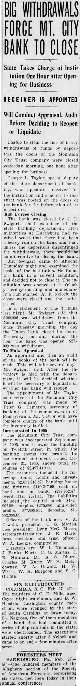 WITHDRAWALS FORCE MT. BANK CLOSE State Takes Charge of Institution One Hour After Open= ing for Business IS APPOINTED Will Conduct Appraisal, Audit Before Deciding to Reopen or Liquidate Unable to stem the tide of heavy withdrawals of funds by depositors. the doors of the Mountain City Trust company closed yesterday morning. one hour after opening for George L. Taylor, special deputy of the state department of bankappointe receiver for the and notice to that the doors the bank for the information of Run Forces Closing bank closed by Swigart chief examiner the department. after authorities Harrisburg had ceived that there had heavy bank and that. unless the depositors discontinued the withdrawals, there alternative closing the bank. Swigart came Altoona Thursday night the books the institution. He found the bank solvent condition, decided not close it. The stitution opened o'clock yesterday morning and immediaterun started. o'clock the doors were closed and the notice posted. In statement to The Tribune last night, Mr. Swigart $400,000 withdrawn from the Mountain City Trust company morning, the the Union bank closed its doors. Yesterday morning during the bank was opened, 000 withdrawn. To Make Appraisal and then an audit books the bank be made. This will take several Mr. Swigart After ventory the department. be whether liquidate or bank reopen The Taylor receiver the Mountain City Trust company made Peter Cameron, secretary banking Mr. Taylor will complete charge of the bank until the inventory Incorporated In 1905 The Mountain Trust company was incorporated September and owns building Twelfth street which banking rooms located. annual statement. issued cember total sources The resources included the lowing items: Loans and house and fixtures. hand and overdrafts. The liabilities included the $77,089.85; deposits, Officers of bank Oswald. president: Mattas, president: Lynn McG. Moses, Hark assistant and trust officer: Leckie, comptroller. Directors are: Banks Kurtz. Oburn. Charles H. Weest. W. H. Burgoon and SIX ELECTROCUTED COLUMBIA, The murders Cayce night and Lexington county merthe state dawn today. Si. five them members band that had committed the state, The executions started shortly after o'clock and came end few minutes seven. FORESTERS MEET hundred members the Allegheny section Society American Foresters comprising today in their annual