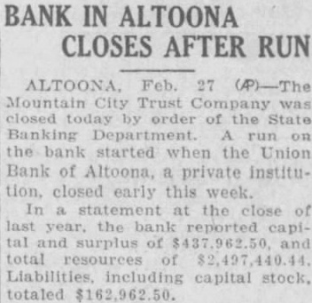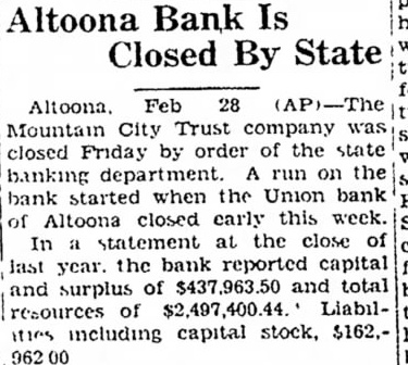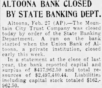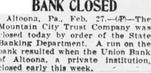 Other: The articles focus mainly on the Union Bank closing early (a private bank) which triggered runs on other Altoona banks; the regulator closed Mountain City Trust, not Union Bank.