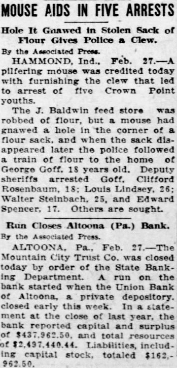 MOUSE AIDS IN FIVE ARRESTS Hole It Gnawed in Stolen Sack of Flour Gives Police a Clew. By the Associated Press. HAMMOND, Ind., Feb. 27.-A pilfering mouse was credited today with furnishing the clew that led to arrest of five Crown Point youths. The J. Baldwin feed store was robbed of flour, but a mouse had gnawed a hole in the corner of a flour sack. and when the sack disappeared later the police followed a train of flour to the home of George Goff. 18 years old. Deputy sheriffs arrested Goff. Clifford Rosenbaum, 18; Louis Lindsey, 26; Walter Steinbach, 25, and Edward Spencer, 17. Others are sought. Run Closes Altoona (Pa.) Bank. By the Associated Press. ALTOONA, Pa., Feb. 27.-The Mountain City Trust Co. was closed today by order of the State Banking Department. A run on the bank started when the Union Bank of Altoona, a private depository. closed early this week. In statement at the close of last year, the bank reported capital and surplus of and total resources of $2, Liabilities, including capital stock, totaled $162,-