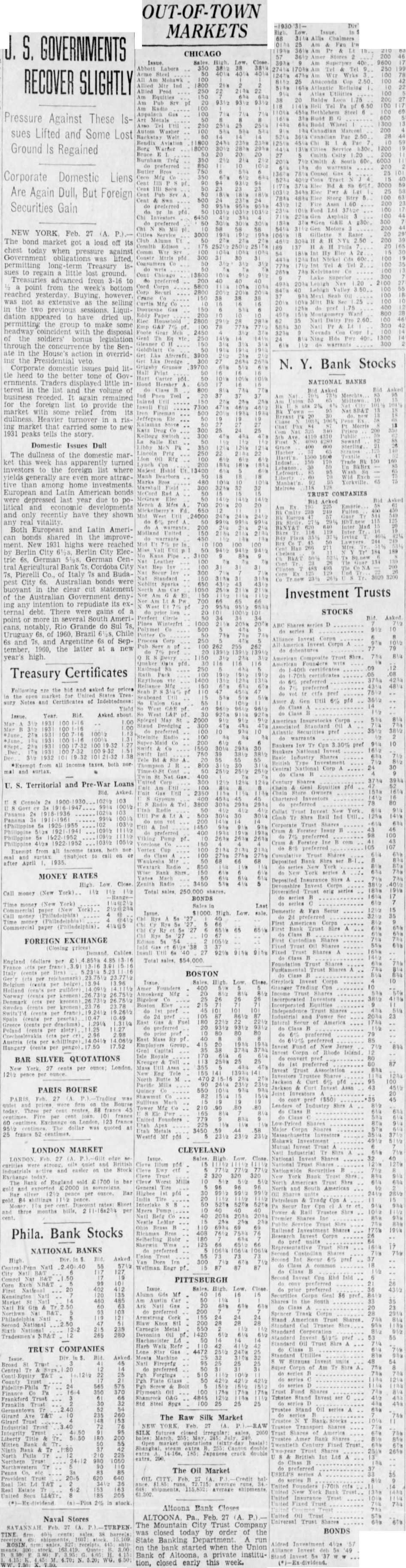 U. S. GOVERNMENTS RECOVER SLIGHTLY OUT-OF-TOWN MARKETS Pressure Against These sues Lifted and Some Lost Ground Is Regained Corporate Domestic Liens Are Again Dull, But Foreign Securities Gain NEW YORK Feb. 27 The bond market got a load off its chest today when against pressure Government obligations lifted Treasury sues regain little lost ground. Treasuries advanced from point from the week's bottom reached as extensive the the two Liquidation appeared to have dried the group to make some coincide with the disposal soldiers' bonus legislation the by the in the action in overridthe Corporate domestic issues paid lit. heed to the better tone of Gov. Traders displayed little terest in the list and the volume of business It again remained the foreign list to provide market with some relief from Heavi turnover in rismarket that carried some to new 1931 peaks tells the story The dullness of the domestic marthis week has apparently turned investors the foreign where are even more attrac than among home investments European and Latin American bonds were depressed last year due to and economic developments only recently have they shown real vitality. Both European and Latin Ameribonds shared in the improve1931 highs reached Berlin City Berlin City 6s German German Agricultural Bank Cordoba City Pierelli Co., of Italy and Buda pest City 6s. Australian bonds were buoyant the clear cut statement of the Australian overnment deny intention to repudiate its exdebt. There were gains a ternal or more in several South Amerinotably Rio Grande do Sul 7s, of Brazil Chile Uruguay and Argentine 6s of September 1960, the latter at new Treasury Certificates Following asked for prices open States Notes 101 from S. Territorial and Pre War from income taxes. call April 935 MONEY RATES High. Low money York) (New York). paper FOREIGN EXCHANGE England BAR SILVER QUOTATIONS London PARIS BOURSE quoted LONDON MARKET CHICAGO Sales Labora Edison N. Y. Bank Stocks Grunow NATIONAL BANKS Class Tool Domestic Issues Dull TRUST Acked Standard Investment Trusts STOCKS Shares Corpn Corpo Composite Trust preferred Insurstocks Bankers 30% Shares Corp Loans Shares Exempt Bank after Deposited Total shares. BONDS de series Domestic Secur Issue. Trust Shares Trust Shares Total Shares Shares BOSTON Invest Shares Fuel Secur America Class Jersey Royale *** Quincy $50) Industry Pwr Mf Investment Invest CLEVELAND Shares quiet and Shares easter Securities England in and American 84 rates: per Pump Phila. Bank Stocks NATIONAL BANKS Dorn 87 Class Engr Invest PITTSBURGH South Trank Knox 280 55 Trust TRUST COMPANIES Asked Super Shares Invest Steel Stand The Raw Silk Market YORK Feb. 27 Fixed Shares The Oil Market series Credit do series Trust Altoona Bank Closes United Trust Naval Stores ALTOONA, Pa., Feb. 27 Trust Shares The Mountain City Trust Company TURPEN BONDS closed today by order of State Banking the bank tarted when the Union Bank of Altoona, private institution, closed early this week. Investment