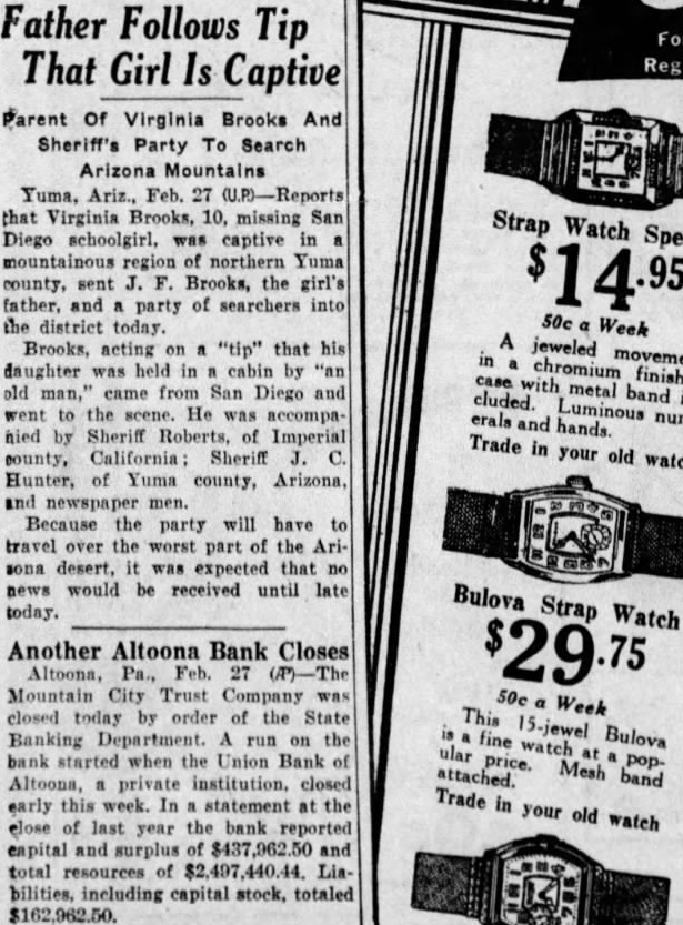 Father Follows Tip That Girl Is Captive Parent Of Virginia Brooks And Sheriff's Party To Search Arizona Mountains Yuma, Ariz., Feb. 27 (U.P)-Reports that Virginia Brooks, 10, missing San Diego schoolgirl. was captive in mountainous region of northern Yuma county, sent J. F. Brooks, the girl's father, and party of searchers into the district today. Brooks, acting on a "tip" that his daughter was held in cabin by "an old man," came from San Diego and went to the scene. He was accompanied by Sheriff Roberts, of Imperial county, California: Sheriff J. C. Hunter, of Yuma county, Arizona and newspaper men. Because the party will have to travel over the worst part of the Arisona desert, it was expected that no news would be received until late today. Another Altoona Bank Closes Altoona, Pa., Feb. 27 (/P)-The Mountain City Trust Company was 50c Week closed today by order of the State This Banking Department. A run on the ular fine price. 15-jewel watch Mesh Bulova pop. bank started when the Union Bank of attached. band Altoona, private institution, closed early this week. In statement at the Trade in your old watch close of last year the bank reported capital and surplus of $437,962.50 and total resources of $2,497,440.44. Liabilities. including capital stock, totaled $162,962.50.
