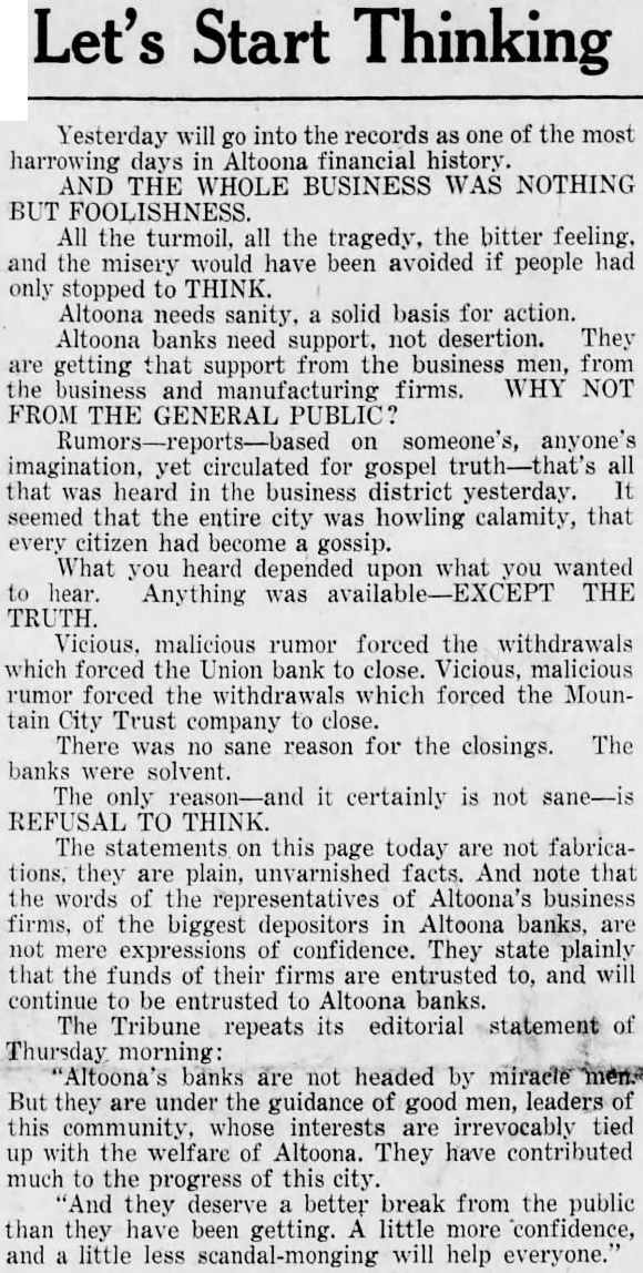 Let's Start Thinking Yesterday will into the records as one of the most harrowing days in Altoona financial history. AND THE WHOLE BUSINESS WAS NOTHING BUT FOOLISHNESS. All the turmoil, all the tragedy, the bitter feeling. and the misery would have been avoided if people had only stopped to THINK. Altoona needs sanity, a solid basis for action. Altoona banks need support, not desertion. They are getting that support from the business men, from the business and firms. WHY NOT FROM THE GENERAL PUBLIC? on anyone's yet circulated for gospel all that was heard in the business district yesterday. seemed that the entire city was howling calamity, that every citizen had become gossip. What you heard depended what you wanted to hear. Anything was THE TRUTH. Vicious. malicious rumor forced the withdrawals which forced the Union bank to close. Vicious, malicious rumor forced the withdrawals which forced the Mountain City Trust company to close. There was no sane reason for the closings. The banks were solvent. The only it certainly is not TO THINK. The statements on this page today are not fabrications, they are plain, unvarnished facts. And note that the words of the representatives of Altoona's business firms, of the biggest depositors in Altoona banks, are not mere expressions of confidence. They state plainly that the funds of their firms are entrusted to, and will continue to be entrusted to Altoona banks. The Tribune its editorial statement of repeats Thursday morning: banks are not headed by miracle But they are under the guidance of good men, leaders of this community, whose interests are irrevocably tied up with the welfare of Altoona. They have contributed much to the progress of this city. "And they deserve a better break from the public than they have been getting. A little more confidence, and a little less will help everyone."