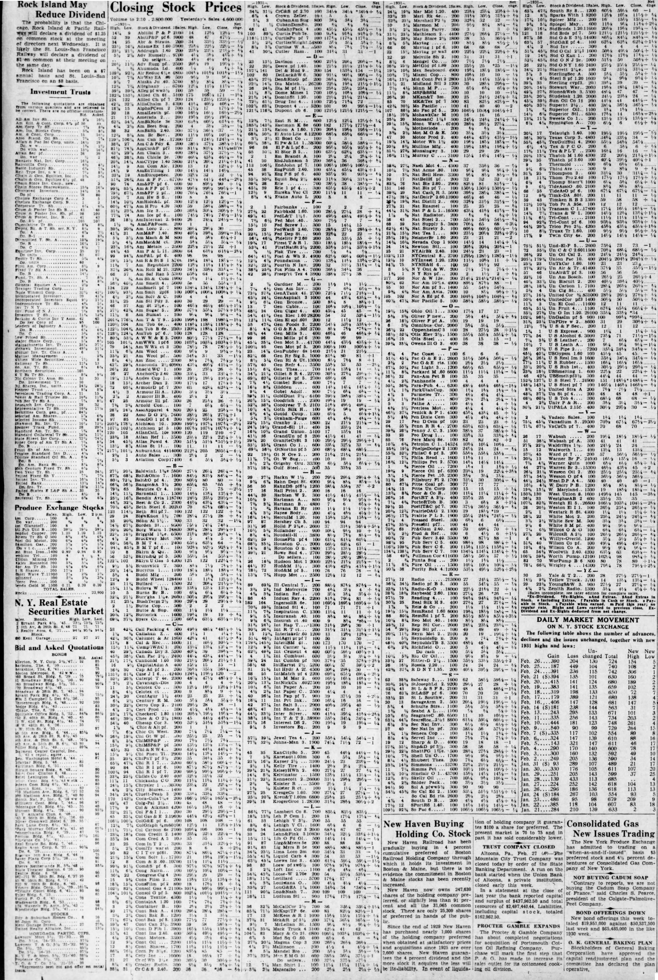 Rock Island May Reduce Dividend The probability is that the Chicago. Rock Island & Pacific Railway will declare a dividend of $1.25 on common stock at the meeting of directors next Wednesday It likely the St. Louis-San Francisco Railway will declare dividend of $1 on common at their meeting on the same day. Rock Island has been on $7 annual basis and St. Louis-San Francisco on an $8 basis. Investment Trusts Gardner GenATank GenAsphalt Bronze Net Net Stock Low Close. Stock High. Closing Stock Prices CrC&S 100 Mar 400 231/4 Crown Zeller 32% 23 Marl Rk 4e 200 Volume to Yesterday's 600 800 32 CubanAm Sug 32% Marshall 10 Marmon M Low Stock Low 46 41 Martin Parry Abitibi P 12% 100 Curtis Pub 89% thieson 1000 CurtisPu May Store Abr 200 54800 Maytag Adams 3900 Curtiss Maytag Addrsgph 40 41 30% Cutler Ham Maytag Adv Rumely 9700 Melville Do 23 Davison Mengel Adv Rum 2500 20% Deere MetGld pt Ahumada 400 Hud 154 Mex Seaboard Reduc 4800 300 Miami Cop Den&RioG pf 200 Mid Cont Alaska Dia Match 26700 Midland Stl Minn M Mines DominSt MKan&T 3m Drug Inc MK&Tex pf following quotations obtained AllisChalm Mo Pacific from and There Dupont 1211/2 Pac pf are no AmalLeath Asked MohawkCar Amerada MonsanC East Corp. Mont Ward Eastman Motherlode Stocks AmBkSh Boat Motor Mullins Mfg AmCar&F Stor Munsingwr Brandt Murray Corp EndJohn Nash Mot EngPubS Nat Acme Bell Gen Bdg NatBellH Nat Bis Evans Auto NatDairP Exchange Distill Fairbanks Enamel FairbksM FedL&T Radiator Steel Mot Screw Supply FedWatS Surety NeisnerBr Firest Nevada Cop Newton NYAirBk NYCentral NYNH&H Equit Pacific Ohio Industry Omnibus Mills Priced Owens GenPubSer Coast 100 1/2 Light Packard Pan-Am Pet Panhandle Gimbel Glidden ParkUtahCop Armour Gobel Adolf Parmelee GoldDust Pathe Armour Goodrich Pathe Arnold Goodyear Peerless Mot AssoApparel Goth Silk Gould Penick Dixie AssoDG D Cem Grand-Sil Penny AtlanCstL GrandUn Drug Ref GraniteCySt Marq Petrolm PhilaC Sales Phila Read Aviation Philips Pet Pierce Oil Steel BaldwinL Pierce Pierce Pet Hackn Balt&O Pillsbury Hahn Bangor&A Pitts HahnDS Beatrice Pitts Hall Barnsdall Harbisn Bendix PortRT Hartman PortoRTob Hartman Produce Exchange Stocks 20200 PrairieO&G Hayes Prairie HerculM Pressed Hershey Ch Borden Holld Pr&Gam Hollander BriggsM Prod Ref Brockway Ser HouseFin Houston Serv Houston Howe Bklyn&Q Pullman Do sellers Punta Sug Hudson Brunswick Hud&M Purity Bak 12600 Hud&M Hupp Mot Radio 213000 Bullard Central Radio TOTAL Motrcycle Radio-K-O 18000 Indian Ref RaybesM Indust Ray Reading N. Y. Real Estate IngersollR Real Inland Reis Securities Market Inspiration RemRand 6000 Butterick Insuransh RemRd Bonds High. 69% Mot Bryant 2600 53 pf Met ReynoldsSp Net High. Low. Stock High. Low. Close. chge 65% South Ry 1200 60 Sparks With 8200 12% Spicer Mfg Spiegel May StdBrnds Brds StdG&E Starrett SterlingSec Sterl Sterling Stewart Stone&Web Studebak Oil Superht Superior Superior 6500 Sweets 200 Symington Telautgh 100 TexGulfSul Thatch Thatch Third Thompson Thom Thomp TideAssoO TideAsO Timk-DA Timken Transam Truax 17% City 200 Und-El-F 2600 73 73 Cal Union 1/8 UnTkCar UnAir&T Am Biscuit Carbon Cig United Cor UnitedCor pf3 29100 100 UnPDye Express Alcohol Leather Leath 100 S Pipe 2 7200 USGypsm Rubber Rub USSmelting 44 Steel Steel pf 200 30% 30 Vadsco Sales Vanadium 71% VaCaCh of 70 68 70 26 Wabash 1/2 Wabash WaldrfSys Walworth Ward pt Warner 24000 Warner 1000 Warren Wesson Wesson Dairy Maryland West Union WestghseAB Westgh 26600 Weston Wextark White White White Wilcox O WilcoxR Wilson Wilson Woolwth Worth Pump 12100 1021/4 98 WorPump 78 80 Wrigley 14300 78 Yale 200 28 Yellow Truck 3700 14 29 22% YoungS&W 900 27 4% 2% Zenith Radio 1300 51/4 Stock. Including Extras. Payable Stock Payregular Stock. rate. Highs and Lows when carried earned. Paid this close. year; ExDividend Ex Rights deducted from net change. previous DAILY MARKET MOVEMENT ReynoldsTB Richfield Cement Do cash Pac Combust Rio Gr CannonM Combn Ritter-D IntHarvst Rossia 100 42% 200 IntMatch 63 Safeway 62 IntNickCa StJosephLd New Haven Buying Holding Co. Stock New Haven Railroad has been gradually buying in percent cumulative preferred of Boston Railroad Holding Company through which it holds its investment in Boston & Maine, but there is no evidence the commitment in Boston & Maine stocks has been recently New Haven now owns 247,630 shares of the holding company preferred. or slightly less than 91 percent and all the 31,065 common stock There are only 25,309 shares of preferred in hands of the pub- ON N. Y. STOCK EXCHANGE The following table shows the number of advances, declines and the issues unchanged, together with new 1931 highs and lows: Un- New New Gain Loss changed Total High Low Feb. 26 390 204 130 724 154 187 449 104 740 108 236 115 742 306 (S)394 630 160 680 189 Bid and Asked Quotations Asked Paper StL&SF pf Southw 389 689 SavageArm 681 Schulte Strs (S)181 Seabd SeagraveC SearsRoe DS 261 Sec Nat Inv Investors Nat Seneca Cop 102 Jewel Servel Inc ChiMSP&P 1900 Sharp Shp&D 78 ShattFG 35 KanCitySo Shell Un Kayser Shubert Thea (S) 489 Simmons Simms Pet 611 Sinclair 599 Kelvinator Skelly Oil Kennecott 685 Snider Pack 618 104 618 Cal 1500 KresgeCo 267 103 554 93 Kreu&T Cal Ed 2600 98 679 209 29% South SPortRS 118 104 607 83 18 So Pac 100 284 210 139 633 2 851/4 18% tion of holding company it guaranConsolidated Gas ColGraph tes $100 share for preferr The Lehman present market is 70 to 75 and in Lehn&Fink New Issues Trading past it has sold considerably lower. The New York Produce Exchange TRUST COMPANY CLOSED has admitted to trading on a Altoona, Pa., Feb. 27 (AP). The issued' basis $5 Mountain City Trust Company was preferred stock and 41/2 percent declosed today by order of the State bentures or Consolidated Gas ComCom&S Loew Loft pany of New York Cong Banking Department. A run on the bank started when the Union Bank Lorillard NOT BUYING CADUM SOAP of Altoona, a private institution, 'Contrary to reports, we are not closed early this week 1/4 buying the Cadum