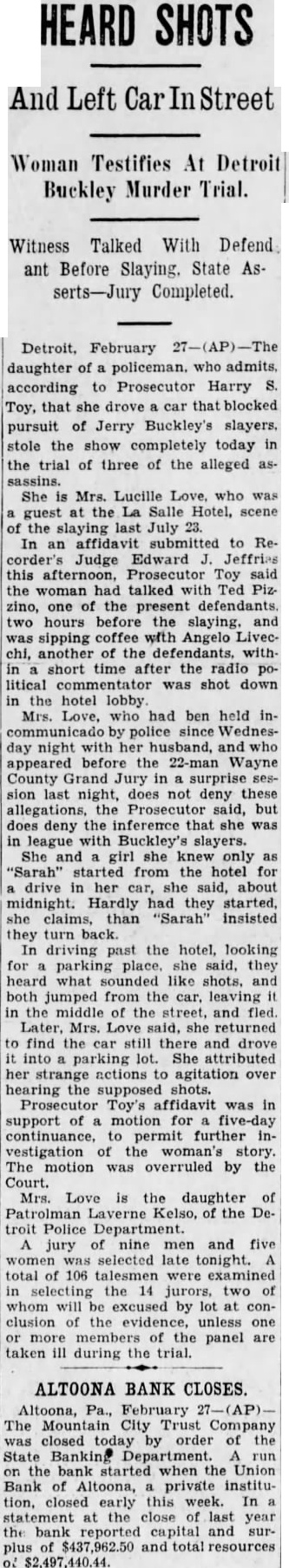 HEARD SHOTS And Left Car In Street Woman Testifies At Detroit Buckley Murder Trial. Witness Talked With Defend ant Before Slaying. State Asserts-Jury Completed. Detroit. February 27-(AP)-The daughter policeman. who admits. according to Prosecutor Harry S. Toy, that she drove car blocked pursuit of Jerry Buckley's slayers. stole the show completely today in the trial of three of the alleged as She Mrs. Lucille Love, who was guest the La Salle Hotel, of the slaying last July In an affidavit submitted to ReJudge Edward Jeffrias this Prosecutor Toy said the woman had talked with Ted Pizzino, one of the defendants. two hours before slaying. and was sipping coffee with Angelo Livecchi, another the defendants. with short time after the radio political was shot down in the hotel lobby Mrs. Love, who had ben held communicado by police Wednesday night with her husband, and who appeared before the 22-man Wayne County Grand Jury in surprise session last night, does not deny these allegations, Prosecutor said, but does deny the inference that she was in league with Buckley's slayers. She and she only "Sarah" started from the hotel for drive in she said, about midnight. Hardly had they started. she than "Sarah" insisted they turn In driving the hotel, looking for parking place, she said, they heard what like shots, and both jumped from the car, leaving in the middle of the street and fled. Mrs she returned to find the car there and drove into parking lot She attributed actions agitation over the supposed shots. Prosecutor Toy's affidavit was in support of motion for five-day continuance, to permit further investigation of the woman's story. The motion overruled by the Court. Mrs. Love is the daughter of Laverne Kelso, of the Detroit Police Department. jury nine men and five women selected late tonight. total of 106 talesmen were examined in selecting the 14 jurors, two whom excused by lot at conclusion the evidence, unless one or more members of the panel are taken ill during the trial. ALTOONA BANK CLOSES. Altoona, February The Mountain City Trust Company closed by order of the State Banking run on the bank started when the Union Bank Altoona, private institution. closed early this week. In statement at the close last year the bank reported capital and total resources $2,497,440.44.