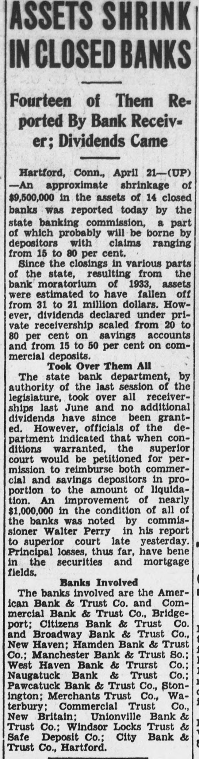 ASSETS SHRINK IN CLOSED BANKS Fourteen of Them Re= ported By Bank Receiv= er; Dividends Came / Hartford, Conn., April 21-(UP) -An approximate shrinkage of $9,500,000 in the assets of 14 closed banks was reported today by the state banking commission, a part of which probably will be borne by depositors with claims ranging from 15 to 80 per cent. Since the closings in various parts of the state, resulting from the bank moratorium of 1933, assets were estimated to have fallen off from 31 to 21 million dollars. However, dividends declared under private receivership scaled from 20 to 80 per cent on savings accounts and from 15 to 50 per cent on commercial deposits. Took Over Them All The state bank department, by authority of the last session of the legislature, took over all receiverships last June and no additional dividends have since been granted. However, officials of the department indicated that when conditions warranted, the superior court would be petitioned for permission to reimburse both commersavings depositors in proto the portion cial and amount of liquidation. An improvement of nearly $1,000,000 in the condition of all of the banks was noted by commissioner Walter Perry in his report I to superior court late yesterday. Principal losses, thus far, have bene in the securities and mortgage fields. Banks Involved I The banks involved are the American Bank & Trust Co. and Commercial Bank & Trust Co., Bridgeport; Citizens Bank & Trust Co. and Broadway Bank & Trust Co., New Haven; Hamden Bank & Trust 1 Co.; Manchester Bank & Trust So.; 1 West Haven Bank & Trurst Co.; 1 Naugatuck Bank & Trust Co.; 1 Pawcatuck Bank & Trust Co., Stonington; Merchants Trust Co., Waterbury; Commercial Trust Co., New Britain; Unionville Bank & Trust Co.; Windsor Locks Trust & Safe Deposit Co.; City Bank & 8 Trust Co., Hartford.