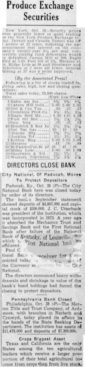 Produce Exchange Securities Mining [By the Associated Press giving sales, high, low and closing quo. Total sales today, 19,300 shares. Hill DIRECTORS CLOSE BANK City National, Of Paducah, Moves To Protect Depositors Paducah Ky Oct. 28 The City National Bank here was closed today by order of its directors. The bank September statement $4,807,000 and capital stock of $300,000 J. C. Utterback was president of the was incorporated in 1873 A year ago absorbed the Trust and Savings Bank and the First National Bank after failure of the National which Bank of Kentucky, of Louisville Still "irst National had affiliated Paul tional Bank for pointed today the Currency as The directors announced heavy withdrawals and shrinkage in value of the bank's bond holdings had forced the closing to protect depositors. Pennsylvania Bank Closed Philadelphia. Oct. 28 (/P)-The Merion Title and Trust Company. of Ardmore, with branches in Narbeth and Cynwyd. today placed its affairs in the hands of the State Banking Department. The institution has assets of $11 478,000 and deposits of $7,300,000. Crops Biggest Asset Texas and California are the only States among the ten agricultural leaders which receive a larger proportion of their total agricultural income from crops than from live stock,