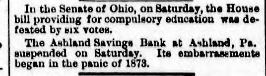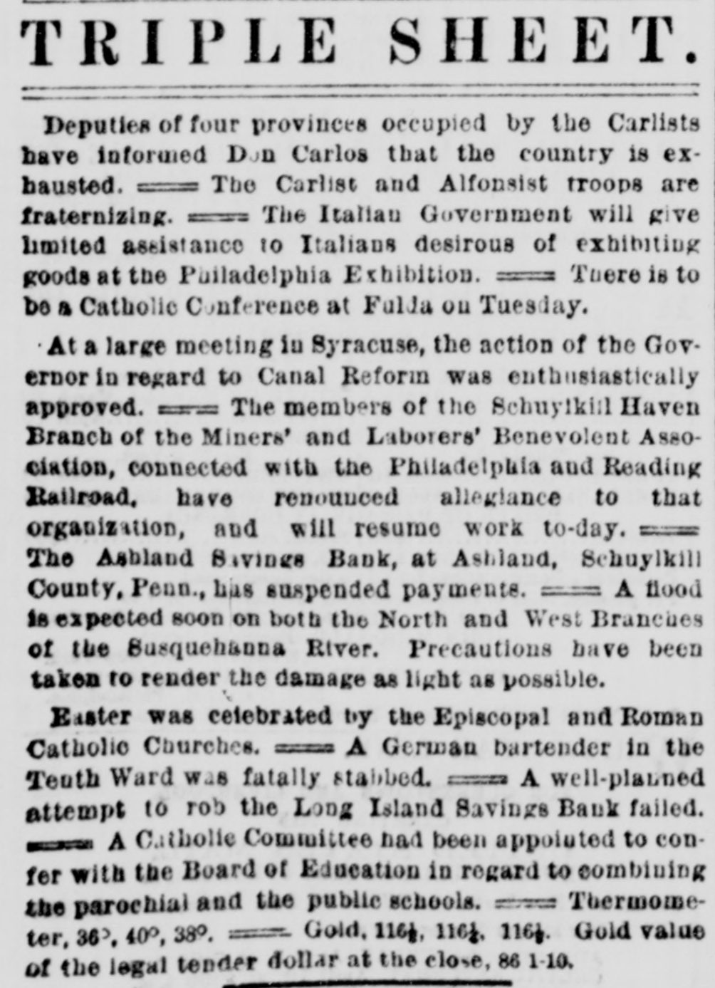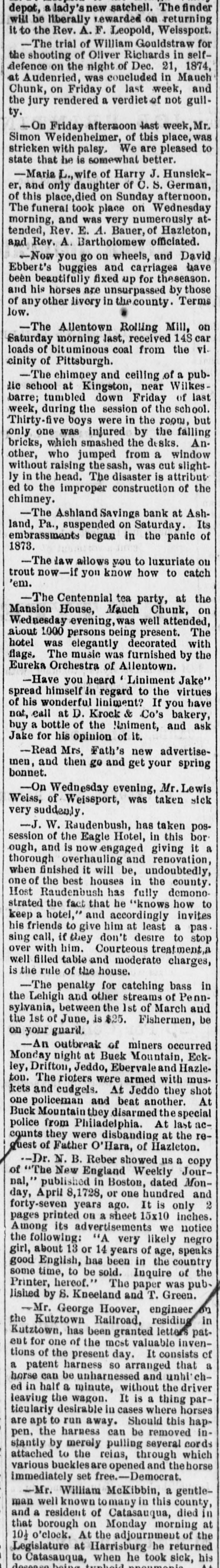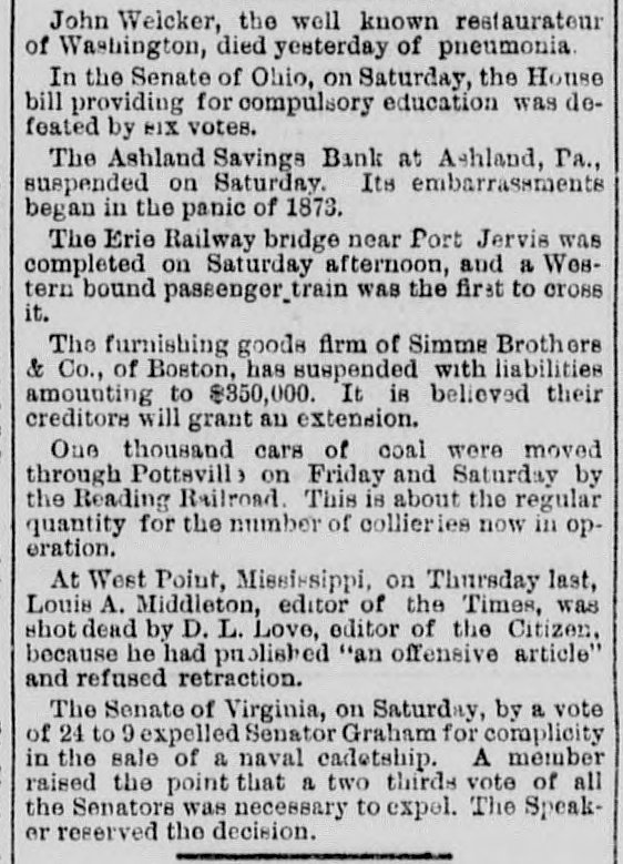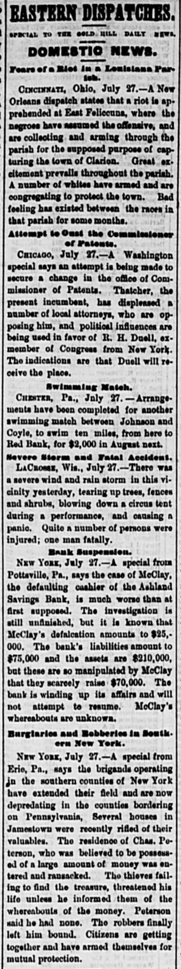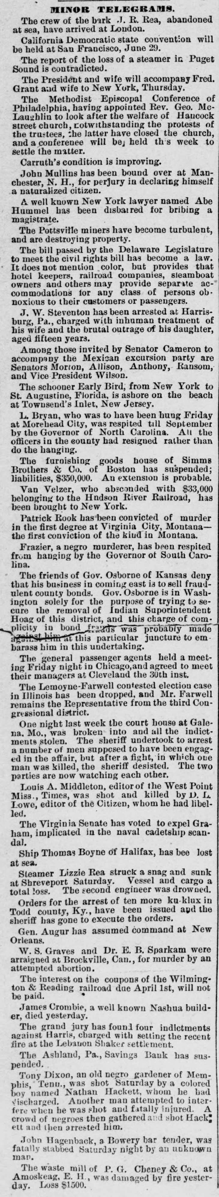 MINOR TELEGRAMS. The crew of the bark J. R. Rea, abandoned at sea, have arrived at London. California Democratic state convention will be held at San Francisco, June 29. The report of the loss of a steamer in Puget Sound is contradicted. The President and wife will accompany Fred. Grant and wife to New York, Thursday. The Methodist Episcopal Conference of Philadelphia, having appointed Rev. Geo. McLaughlin to look after the welfare of Hancock street church, cotwithstanding the protests of the trustees, the latter have closed the church, and a conference will be held this week to settle the matter. Carruth's condition is improving. John Mullins has been bound over at Manchester, N. H., for perjury in declaring himself a naturalized citizen. A well known New York lawyer named Abe Hummel has been disbaired for bribing a magistrate. The Pottsville miners have become turbulent, and are destroying property. The bill passed by the Delaware Legislature to meet the civil rights bill has become a law. It does not mention color, but provides that hotel keepers, railroad companies, sleamboat owners and others may provide separate accommodations for any class of persons ob. noxious to their customers or passengers. J. W. Steventon has been arrested at Harrisburg, Pa., charged with inhuman treatment of his wife and the brutal outrage of his daughter, aged fifteen years. Among those invited by Senator Cameron to accompany the Mexican excursion party are Senators Morton, Allison, Anthony, Ransom, and Vice President Wilson. The schooner Early Bird, from New York to St. Augustine, Florida, is ashore on the beach at Townsend's Inlet, New Jersey. L. Bryan, who was to have been hung Friday at Morehead City, was respited till September by the Governor of North Carolina. All the officers in the county had resigned rather than do the hanging. The furnishing goods house of Simms Brothers & Co. of Boston has suspended; liabilities, $350,000. An extension is probable. Van Velzer, who absconded with $33,000 belonging to the Hndson River Railroad, has been brought to New York. Patrick Rook has been convicted of murder in the first degree at Virginia City, Montanathe first conviction of the kind in Montana. Frazier, a negro murderer, has been respited from hanging by the Governor of South Carolina. The friends of Gov. Osborne of Kansas deny that his business in coming east is to sell fraudulent county bonds. Gov. Osborne is in Washington solely for the purpose of trying to secure the removal of Indian Suporintendent Hoag of this district, and this charge of complicity in bond frauds was probably made against him at this particular juncture to embarass him in this undertaking. The general passenger agents held a meeting Friday night in Chicago,and agreed to meet their managers at Cleveland the 30th inst. The Lemoyne-Farwell contested election case in Illinois has been dropped, and Mr. Farwell remains the Representative from the third Congressional district. One night last week the court house at Galena. Mo., was broken into and all the indictments stolen. The sheriff undertook to arrest a number of men supposed to have been engaged in the affair, but after a fight, in which one man was killed, the sheriff desisted. The two parties are now watching each other. Louis A. Middleton, editor of the West Point Miss., Times, was shot and killed by D. L. Lowe, editor of the Citizen, whom he had libelled. The Virginia Senate has voted to expel Graham, implicated in the naval cadetship scandal. Ship Thomas Boyne of Halifax, has bee lost at sea. Steamer Lizzie Rea struck a snag and sunk at Shreveport Saturday. Vessel and cargo a total loss. The second engineer was drowned. Orders for the arrest of ten more ku-klux in Todd county, Ky., have been issued and the sheriff has gone to execute the orders. Gen. Augur has assumed command at New Orleans. W. S. Graves and Dr. E. B. Sparkam were arraigned at Brockville, Can., for murder by an attempted abortion. The interest on the coupons of the Wilmington & Reading railroad due April 1st, will not be paid. James Crombie, a well known Nashua builder, died yesterday. The grand jury has found four indictments against Harris, charged with setting the recent fire at the Lebanon Shaker settlement. The Ashland, Pa., Savings Bank has suspended. Tony Dixon, an old negro gardener of Memphis, Tenn., was shot Saturday by a colored boy named Nathan Hackett, whom he bad Vischarged. Another man attempted to interfere when he was shot and fatally injured. A crowd of negroes then gathered and shot Hack: ett and then arrested him. John Hagenback, a Bowery bar tender, was fatally stabbed Saturday night by an unknown man. The waste mill of P. G. Cheney & Co., at Amoskeag, E. H., was damaged by fire yesterday. Loss $1500.