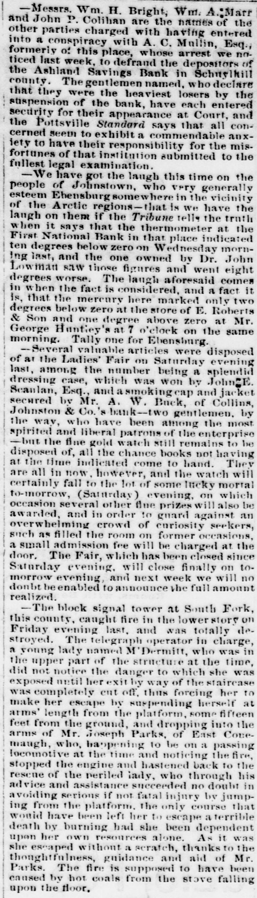 -Messrs. Wm. H. Bright, Wm. A. Marr and John P. Colihan are the names of the other parties charged with having entered into a conspiracy with A. C. Mullin, Esq., formerly of this place, whose arrest we noticed last week, to defraud the depositors of the Ashland Savings Bank in Schuylkill county. The gentlemen named, who deciare that they were the heaviest losers by the suspension of the bank, have each entered security for their appearance at Court, and the Pottsville Standard says that all concerned seem to exhibit a commendable anxiety to have their responsibility for the misfortunes of that institution submitted to the fullest legal examination. -We have got the laugh this time on the people of Johnstown, who very generally esteem Ebensburg somewhere in the vicinity of the Arctic regions-that is we have the laugh on them if the Tribune tells the truth when it says that the thermometer at the First National Bank in that place indicated ten degrees below zero on Wednesday morning last, and the one owned by Dr. John Lowmatt saw those figures and went eight degrees worse. The laugh aforesaid comes in when the fact is considered, and a fact it is, that the mercury here marked only two degrees below zero at the store of E. Roberts & Son and one degree above zero at Mr. George Huntley's at 7 o'clock on the same morning. Tally one for Ebensburg. -Several valuable articles were disposed of at the Ladies' Fair on Saturday evening last, among the number being a splendid dressing case, which was won by John E. Scanlan, Esq., and a smoking cap and jacket secured by Mr. A. W. Buck, of Collins, Johnston & Co.'s bank-two gentlemen, by the way, who have been among the most spirited and liberal patrons of the enterprise -but the fine gold watch still remains to be disposed of, all the chance books not having at the time indicated come to hand. They are all in now, however, and the watch will certainly fall to the lot of some lucky mortal to-morrow, (Saturday) evening, on which occasion several other flue prizes will also be awarded, and in order to guard against an overwhelming crowd of curiosity seekers, such as filled the room on former occasions, a small admission fee will be charged at the door. The Fair, which has been closed since Saturday evening, will close finally on to-morrow evening, and next week we will no donbt be enabled to announce the full amount realized. -The block signal tower at South Fork, this county, caught fire in the lower story on Friday evening last, and was totally destroyed. The telegraph operator in charge, a young lady named M'Dermitt, who was in the upper part of the structure at the time, did not notice the danger to which she was exposed until her exit by way of the staircase was completely cut off, thus forcing her to make her escape by suspending herself at arms' length from the platform, some fifteen feet from the ground, and dropping into the arms of Mr. Joseph Parks, of East Cone-maugh, who, happening to be on a passing locomotive at the time and noticing the fire, stopped the engine and hastened back to the rescue of the periled lady, who through his advice and assistance succeeded no doubt in avoiding serious if not fatal injury by jumping from the platform, the only course that would have been left her to escape a terrible death by burning had she been dependent upon her own resources alone. As it was she escaped without a scratch, thanks to the thoughtfulness, guidance and aid of Mr. Parks. The fire is supposed to have been caused by hot coals from the stove falling upon the floor,