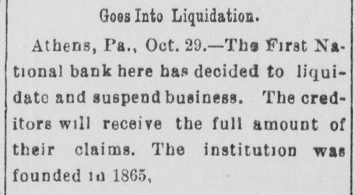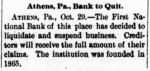 Athens, Pa., Bank to Quit. ATHENS, Pa., Oct. 29.-The First National Bank of this place has decided to liquidate and suspend business. Creditors will receive the full amount of their claims. The institution was founded in 1865.