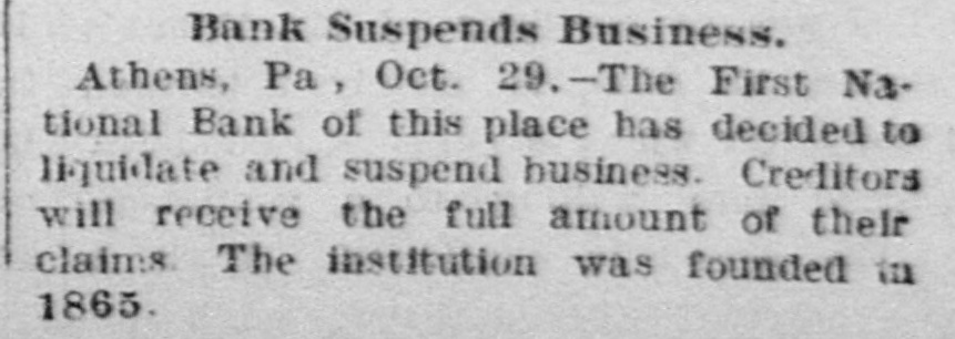 Bank Suspends Business. Athens, Pa, Oct. 29.+The First Na tional Bank of this place has decided to liquidate and suspend business. Creditors will receive the full amount of their claims. The institution was founded in 1865.