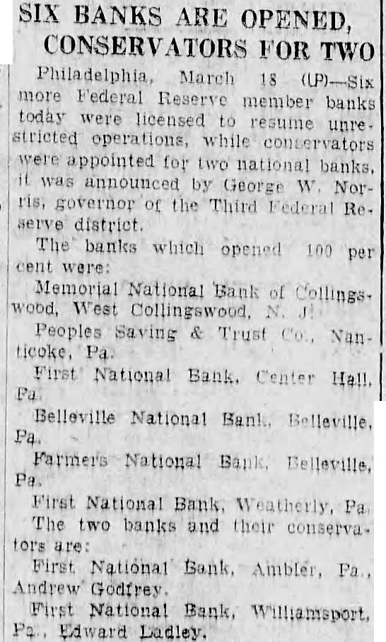 SIX BANKS ARE OPENED, FOR TWO Philadelphia, March 18 more Federal Reserve member banks today were licensed resume unre stricted operations, conservators were appointed for two national banks. was announced by George Norris, governor the Third Federal ReThe banks which opened 100 per cent were: Bank of wood, West Peoples Saving Trust NanFirst National Bank. Center Hall. Belleville National Bank. Belleville, Bank Belleville, Pa. First National Bank Weatherly, Pa The two banks and their are First National Bank Ambler, Andrew First National Bank, Williamsport, Edward Ladley.