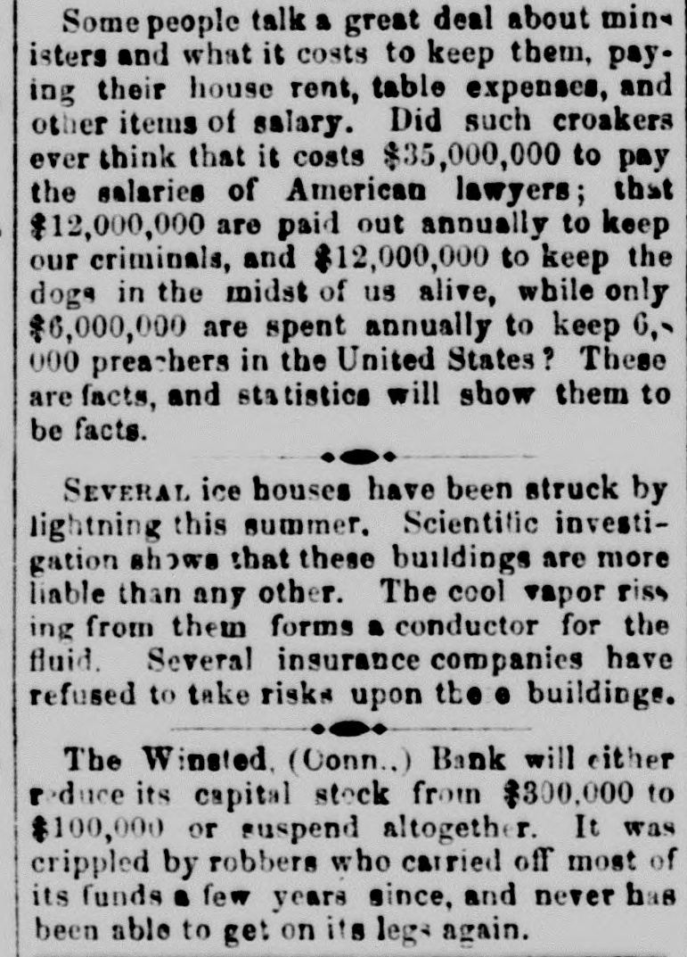 Some people talk a great deal about ministers and what it costs to keep them, paying their house rent, table expenses, and other items of salary. Did such croakers ever think that it costs $35,000,000 to pay the salaries of American lawyers; that $12,000,000 are paid out annually to keep our criminals, and $12,000,000 to keep the dogs in the midst of us alive, while only $6,000,000 are spent annually to keep 6, 000 preachers in the United States? These are facts, and statistics will show them to be facts. SEVERAL ice houses have been struck by lightning this summer. Scientific investigation shows that these buildings are more liable than any other. The cool vapor riss ing from them forms a conductor for the fluid. Several insurance companies have refused to take risks upon the buildings. The Winsted. (Conn..) Bank will either reduce its capital stock from $300,000 to $100,000 or suspend altogether. It was crippled by robbers who carried off most of its funds a few years since, and never has been able to get on its legs again.