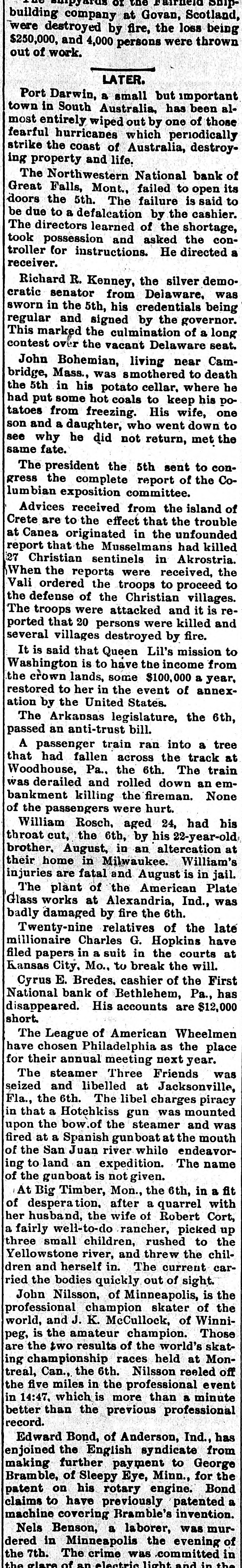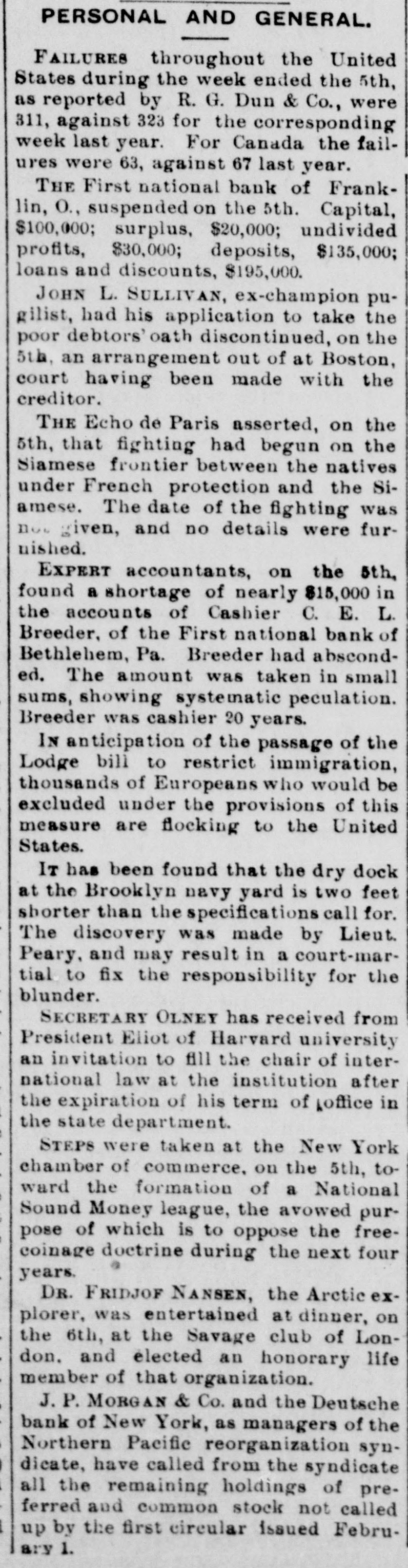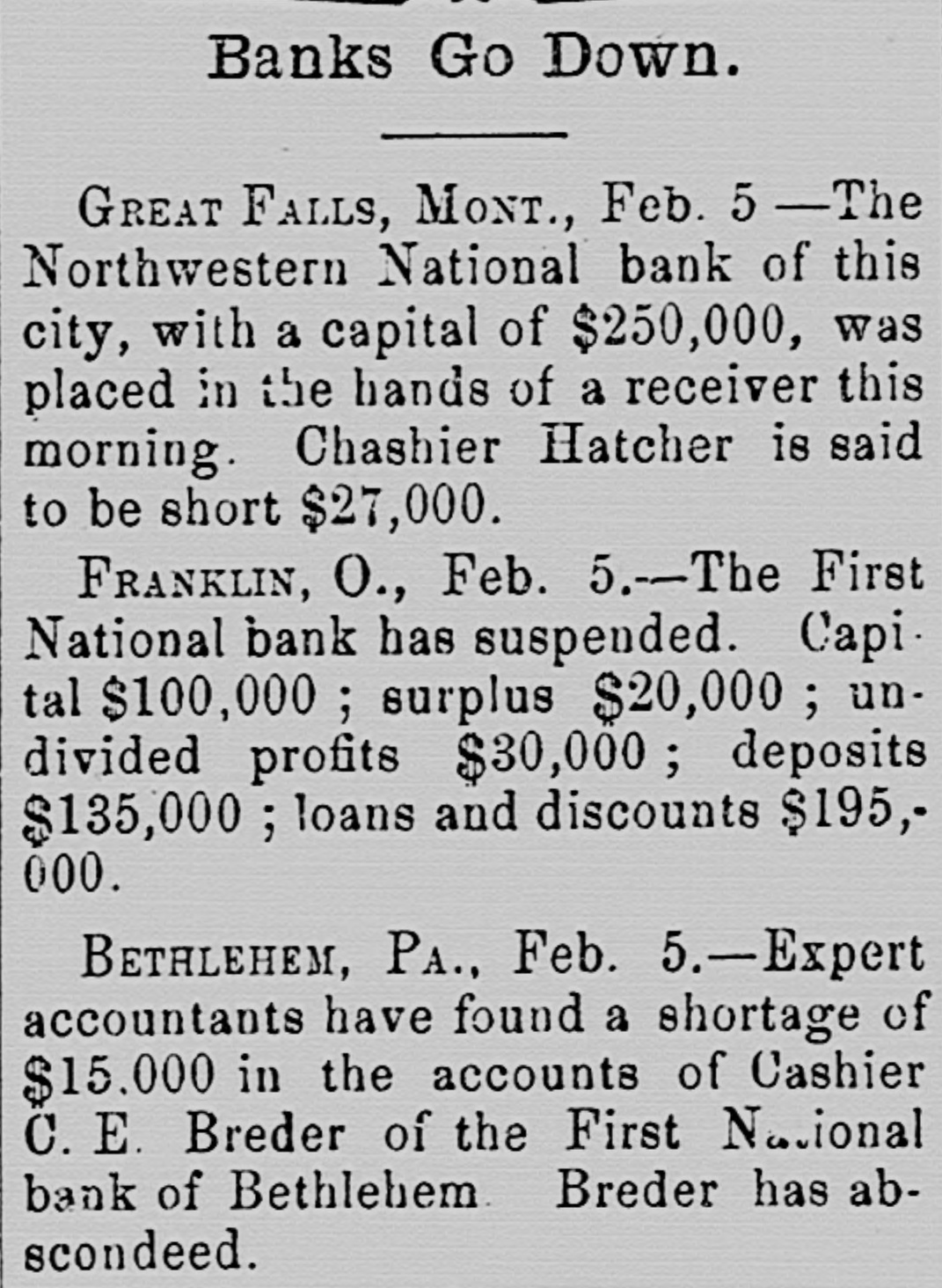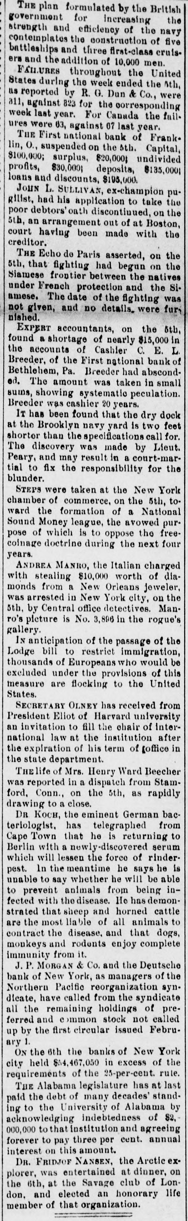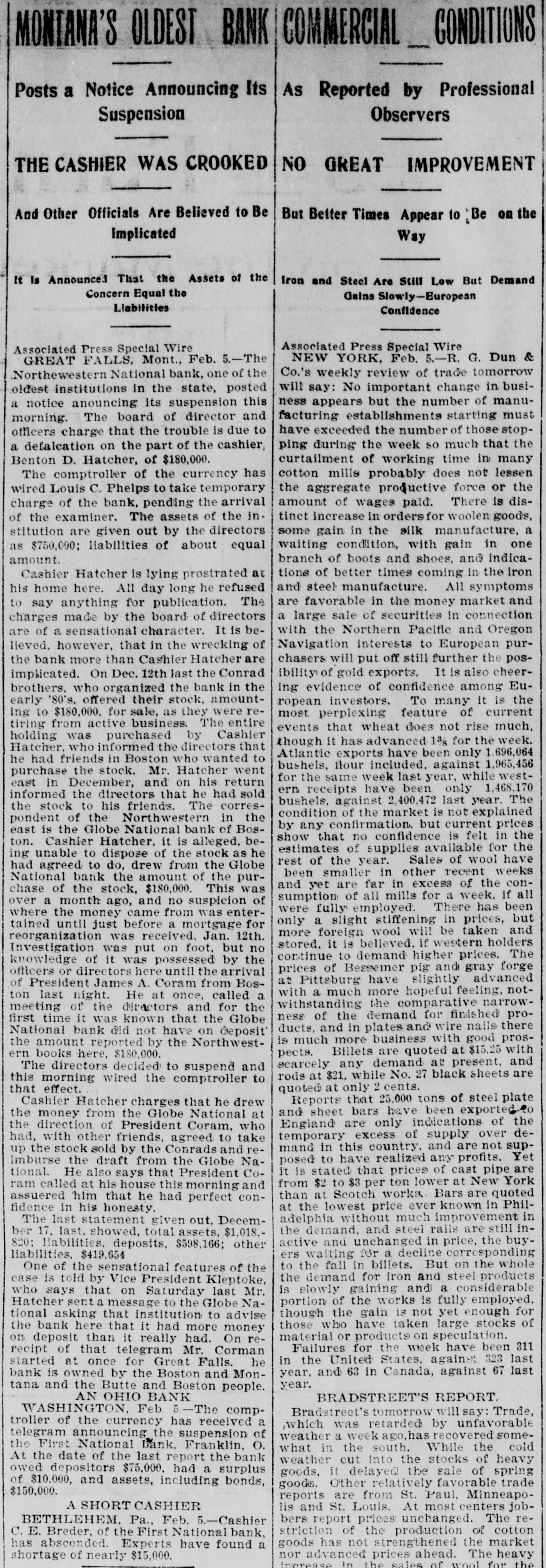 BANK OLDEST COMMERCIAL MONTANA'S Posts a Notice Announcing Its As Reported by Professional Observers Suspension NO GREAT IMPROVEMENT THE CASHIER WAS CROOKED And Other Officials Are Believed to Be But Better Times Appear to Be on the Implicated Way It Is Announce: That the Assets of the Iron and Steel Are Still Low But Demand Concern Equal the Gains Slowly-European Liabilities Confidence Associated Press Special Wire Associated Press Special Wire NEW YORK, Feb. 5.-R. G. Dun & GREAT FALLS, Mont., Feb. 5.-The Co.'s weekly review of trade tomorrow Northewestern National bank, one of the will say: No important change in busioldest institutions in the state, posted ness appears but the number of manua notice anouncing its suspension this facturing establishments starting must morning. The board of director and have exceeded the number of those stopofficers charge that the trouble is due to ping during the week so much that the a defalcation on the part of the cashier, curtailment of working time in many Benton D. Hatcher, of $180,000. cotton mills probably does not lessen The comptroller of the currency has the aggregate productive force or the wired Louis C. Phelps to take temporary amount of wages paid. There is discharge of the bank, pending the arrival tinct increase in orders for woolen goods, of the examiner. The assets of the insome gain in the silk manufacture, a stitution are given out by the directors swaiting condition, with gain in one as $750,000; liabilities of about equal branch of boots and shoes, and indicaamount. tions of better times coming in the iron Cashier Hatcher is lying prostrated at and steel manufacture. All symptoms his home here. All day long he refused are favorable in the money market and to say anything for publication. The a large sale of securities in connection charges made by the board of directors with the Northern Pacific and Oregon are of a sensational character. It is beNavigation interests to European purlieved. however, that in the wrecking of chasers will put off still further the posthe bank more than Cashier Hatcher are libility of gold exports. It is also cheerimplicated. On Dec. 12th last the Conrad ing evidence of confidence among Eubrothers, who organized the bank in the early '80's, offered their stock, amountropean investors. To many it is the ing to $180,000. for sale, as they were remost perplexing feature of current tiring from active business. The entire events that wheat does not rise much, holding was purchased by Cashier though it has advanced for the week. Hatcher, who informed the directors that Atlantic exports have been only 1.696.064 he had friends in Boston who wanted to bushels, flour included, against 1.965.456 purchase the stock. Mr. Hatcher went for the same week last year, while westeast in December, and on his return ern receipts have been only 1.468.170 informed the directors that he had sold bushels, against 2,400,472 last year. The the stock to his friends. The correscondition of the market is not explained pondent of the Northwestern in the by any confirmation. but current prices east is the Globe National bank of Bosshow that no confidence is felt in the ton. Cashier Hatcher, it is alleged, beestimates of supplies available for the ing unable to dispose of the stock as he rest of the year. Sales of wool have had agreed to do, drew from the Globe been smaller in other recent weeks National bank the amount of the purand yet are far in excess of the conchase of the stock, $180,000. This was sumption of all mills for a week. if all over a month ago, and no suspicion of were fully employed. There has been where the money came from was enteronly a slight stiffening in prices, but tained until just before a mortgage for more foreign wool will be taken and reorganization was received. Jan. 12th. stored. it is believed. if western holders Investigation was put on foot. but no continue to demand higher prices. The knowledge of it was possessed by the prices of Bessemer pig and gray forge officers or directors here until the arrival at Pittsburg have slightly advanced of President James A. Coram from Boswith a much more hopeful feeling, notton last night. He at once, called a withstanding the comparative narrowmeeting of the directors and for the ness of the demand for finished profirst time it was known that the Globe ducts, and in plates and wire nails there National bank did not have on deposit is much more business with good prosthe amount reported by the Northwestpects. Billets are quoted at $15.25 with ern books here, $180,000. scarcely any demand at present, and The directors decided to suspend and rods at $21. while No. 27 black sheets are this morning wired the comptroller to that effect. quoted at only 2 cents. Reports that 25,000 tons of steel plate Cashier Hatcher charges that he drew and sheet bars have been exported.ru the money from the Globe National at England are only indications of the the direction of President Coram, who temporary excess of supply over dehad, with other friends, agreed to take mand in this country. and are not supup the stock sold by the Conrads and reposed to have realized any profits. Yet imburse the draft from the Globe Nait is stated that prices of cast pipe are tional. He also says that President Cofrom $2 to $3 per ton lower at New York ram called at his house this morning and than at Scotch works Bars are quoted assuered him that he had perfect conat the lowest price ever known in Philfidence in his honesty. adelphia without much improvement in The last statement given out. Decemthe demand, and steel rails are still inber 17. last, showed, total assets, $1,018.active and unchanged in price, the buy820: liabilities, deposits, $598,166; other ers waiting for a decline corresponding liabilities, $419,654 to the fall in billets. But on the whole One of the sensational features of the the demand for iron and steel products case is told by Vice President Kleptoke, is slowly gaining and a con