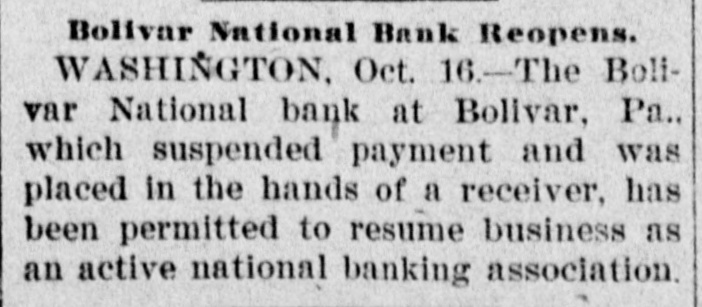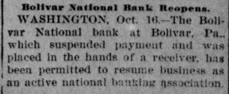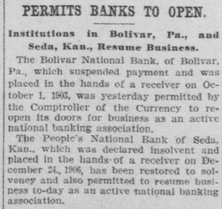 PERMITS BANKS TO OPEN. Institutions in Bolivar, Pa., and Seda, Kan., Resume Business. The Bolivar National Bank, of Bolivar, Pa., which suspended payment and was placed in the hands of a receiver on October 1, 1903, was yesterday permitted by the Comptroller of the Currency to re= open its doors for business as an active national banking association. The People's National Bank of Seda, Kan., which was declared insolvent and placed in the hands. of a receiver on December 24., 1906, has been restored to solvency and also permitted to resume business to-day as an active national banking association.