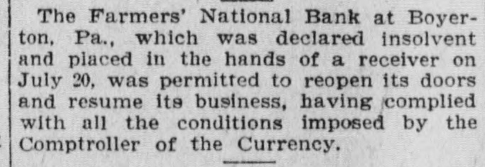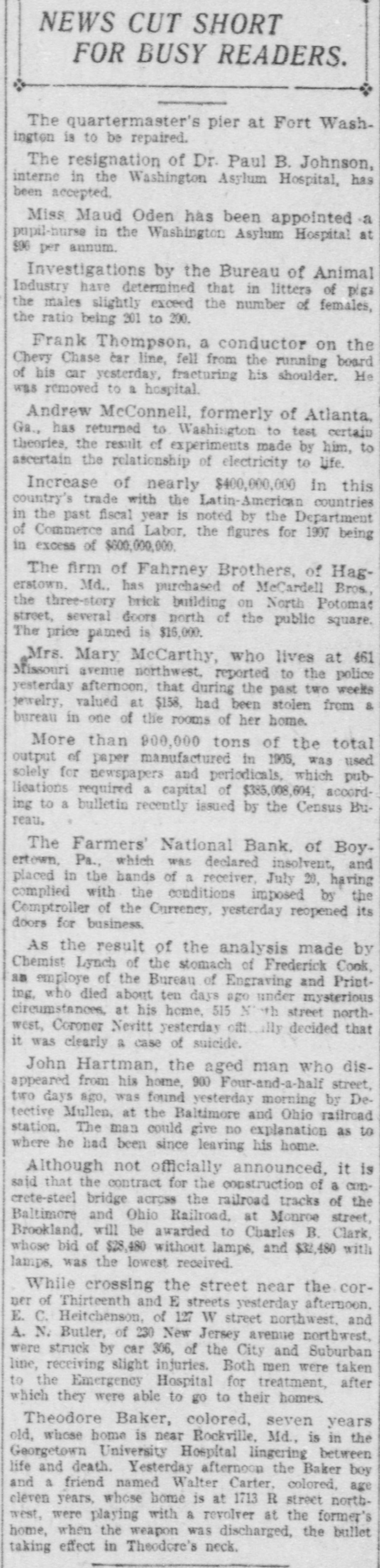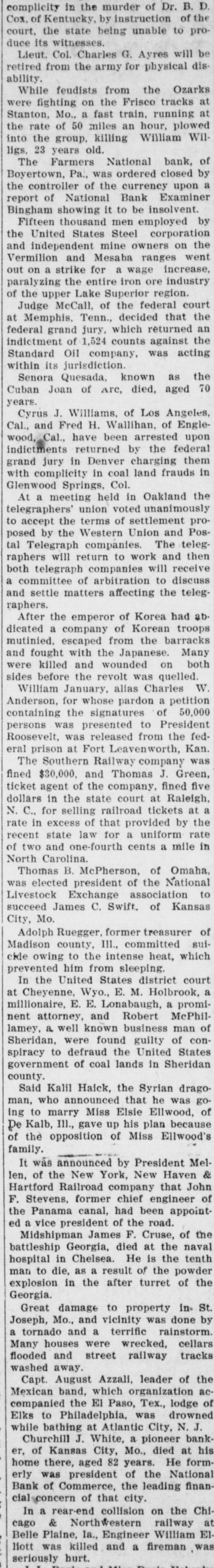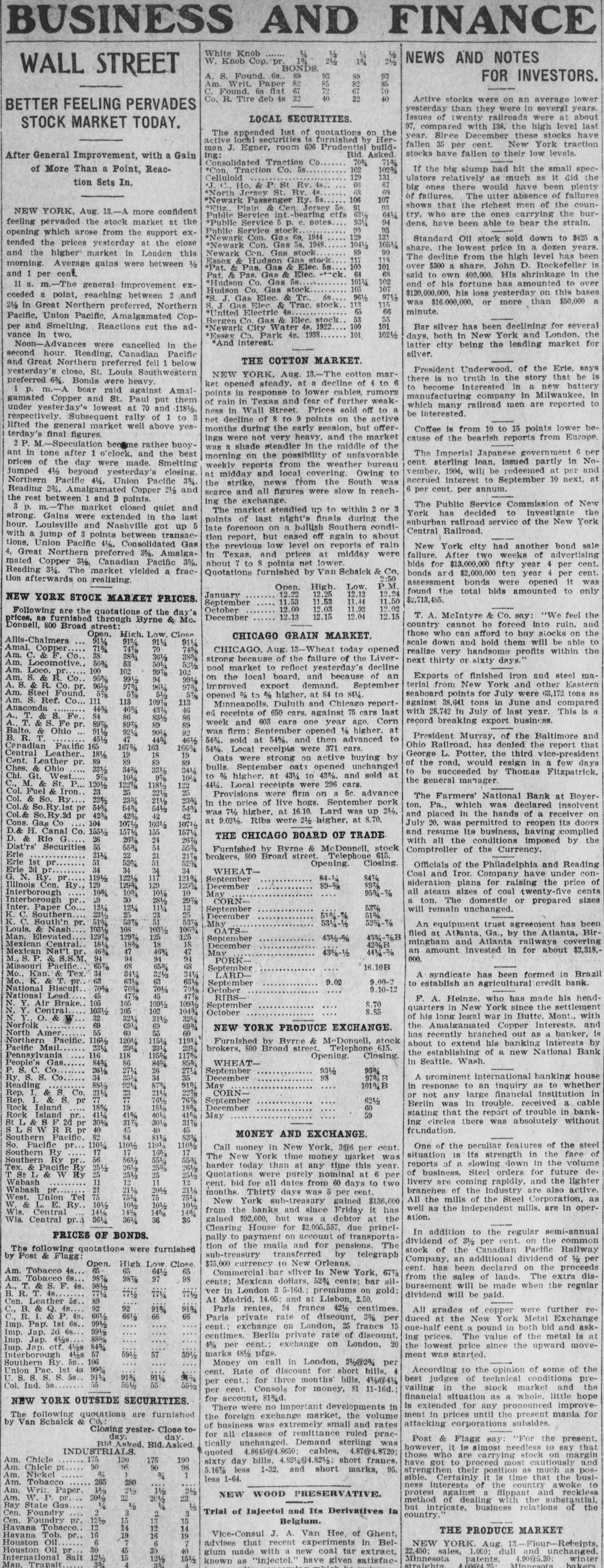 BUSINESS AND FINANCE White Knob 1/4 ....... ½ NEWS AND NOTES 13/4 1% 2½ W. Knob Cop. pr 2½ BONDS. WALL STREET 93 89 93 A. S. Found. 6s. 89 FOR INVESTORS. 82 85 85 Am Writ. Paper 82 67 Found. 6g flat 67 40 40 32 Co. R. Tire deb 4s 32 Active stocks were on an average lower BETTER FEELING PERVADES yesterday than they were in several years. Issues of twenty railroads were at about LOCAL SECURITIES. STOCK MARKET TODAY. 97, compared with 138. the high level last The appended hst of quotations on the year. Sirce December these stocks have active local is furnished by Herfallen 35 per cent. New York traction man J. Egner, room 606 Prudentis buildstocks have fallen to their low levels. Bid. Asked. Ing: After General Improvement, with a Gain Consolidated Traction Co 71% 70% 102 If the big slump had hit the small spec*Con. Traction Co. 5s of More Than a Point, Reac1023/4 131 129 Celluloid ulators relatively as much as it did the tion Sets In. 66 67 'J. Ho. & P. St Rv. 4s. big ones there would have been plenty 68 69 *North Jersey St. Rv. 4s of failures. The utter absence of failures 106 107 *Newark Passenger Ry. 5s shows that the richest men of the coun"Eliz. Plain & Cen Jersey 5s NEW YORK, Aug. 13.-A more confident 631/2 try. who are the ones carrying the burPublic Service int bearing etfs 641/4 94 feeling pervaded the stock market at the *Publie Service 5 p. e. notes. 931/4 dens, have been able to bear the strain. 90 93 Public Service stock opening which arose from the support ex129 131 *Newark Con. Gas 6s. 1944 Standard Oil stock sold down to $425 a tended the prices yesterday at the close "Newark Con. Gas 5s. 1948 1041/2 1051/4 share. the lowest price in a dozen years. 90 89 and the higher market in London this Newark Con. Gas stock The decline from the high level has been 118 117 Essex & Hudson Gas stock morning. Average gains were between ½ over $300 a share. John D. Rockefeller is 100 101 Pat. & Pas. Gas & Elec. 5s 64 68 and per cent. said to own 400,000. His shrinkage in the Pat. & Pas. Gas & Elec. -t~ck. 102 1011/4 *Hudson Co. Gas 5s end of his fortune has amounted to over 11 a. m.-The general improvement ex105 107 Hudson Co. Gas stock $120,000,000. his loss yesterday on this bases ceeded a point, reaching between 2 and 68 961/2 9732 S. J. Gas Elec. & Tr. was $16,000,000, or more than $50,000 a 115 113 Gas Elec & Trac. stock 2½ In Great Northern preferred, Northern 65 66 minute. *United Electric 4s. Pacific, Union Pacific, Amalgamated Cop53 55 Bergen Gas & Elec. stock 100 101 Bar silver has been declining for several per and Smelting. Reactions cut the ad*Newark City Water 4s. 1922 vance in two. 101 1021/2 *Essex Park 4s. 1938 days, both in New York and London, the *And interest. Noon-Advances were cancelled in the latter city being the leading market for silver. second hour. Reading. Canadian Pacific THE COTTON MARKET. and Great Northern preferred fell 1 below President Underwood. of the Erie. says yesterday's close, St. Louis Southwestern NEW YORK, Aug. 13.-The cotton marthere is no truth in the story that he is preferred 6%. Bonds were heavy. ket opened steady, at a decline of 4 to 6 to become interested in a new battery 1 p. m.-A bear raid against Amalpoints in response to lower cables, rumors manufacturing company in Milwaukee, in gamated Copper and St. Paul put them of rain in Texas and fear of further weakwhich many railroad men are reported to under yesterday's lowest at 70 and 118½, ness in Wall Street. Prices sold off to a be interested. respectively. Subsequent rally of 1 to 3 net decline of 8 to 9 points on the active lifted the general market well above yesmonths during the early session, but offerCoffee is from 10 to 15 points lower beterday's final figures. ings were not very heavy, and the market cause of the bearish reports from Europe. 2P. M.-Speculation become rather buoywas a shade steadier in the middle of the The Imperial Japanese government 6 per ant in tone after 1 o'clock, and the best morning on the possibility of unfavorable cent. sterling loan, issued partly in Noprices of the day were made. Smelting weekly reports from the weather bureau vember. 1904, will be redeemed at par and jumped 41/2 beyond yesterday's closing, at midday and local covering. Owing to accrued interest to September 10 next, at Northern Pacific 4½, Union Pacific 3%. the strike, news from the South was 6 per cent. per annum. Reading 2%. Amalgamated Copper 21/2 and scarce and all figures were slow in reachthe rest between and 2 points. ing the exchange. The Public Service Commission of New 3 p. m.-The market closed quiet and The market steadied up to within 2 or 3 York has decided to investigate the strong. Gains were extended in the last points of last night's finals during the suburban railroad service of the New York hour. Louisville and Nashville got up 5 late forenoon on a bullish Southern condiCentral Railroad. with a jump of 3 points between transaction report, but eased off again to about tions, Union Pacific 41/8, Consolidated Gas the previous low level on reports of rain New York city had another bond sale 4, Great Northern preferred 3%, Amalgain Texas. and prices at midday were failure. After two weeks of advertising mated Copper 31/2, Canadian Pacific 3%. about 7 to 8 points net lower bids for $13,000,000 fifty year 4 per cent. Reading 31/4. The market vielded a fracQuotations furnished by Van Schaick & Co. bonds ard $2,000,000 ten year 4 per cent. 2:50 tion afterwards on realizing. assessment bonds were opened it was Open. High. Low. P.M. found the total bids amounted to only 12.22 12.25 12.12 12.24 January NEW YORK STOCK MARKET PRICES. $2,713,485. 11.50 11.53 11.53 11.44 September 12.02 12.03 12.00 11.92 October Following are the quotations of the day's T. A. McIntyre & Co. any: "We feel the 12.04 12.15 12.15 12.13 December prices, as furnished through Byrne & Mc. country cannot be forced into ruin. and Donnell, 800 Broad street: those who can afford to buy stocks on the Op
