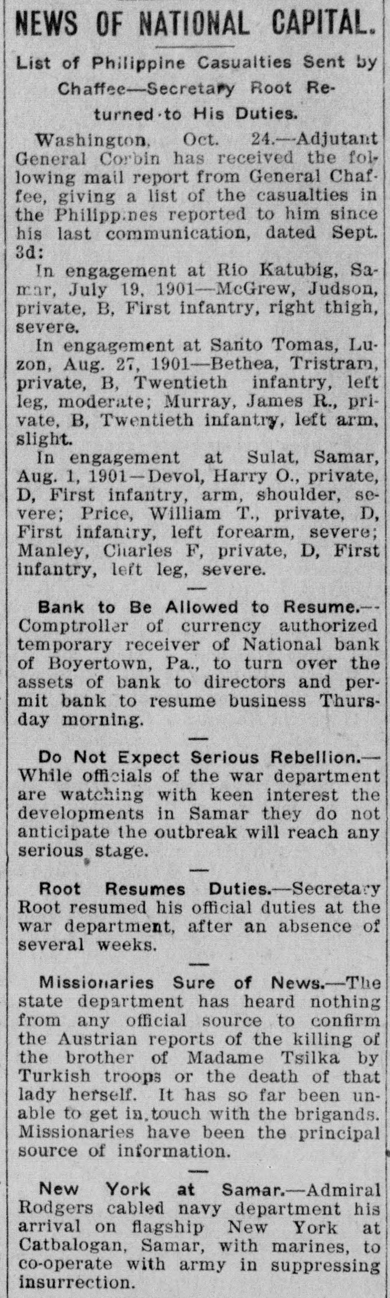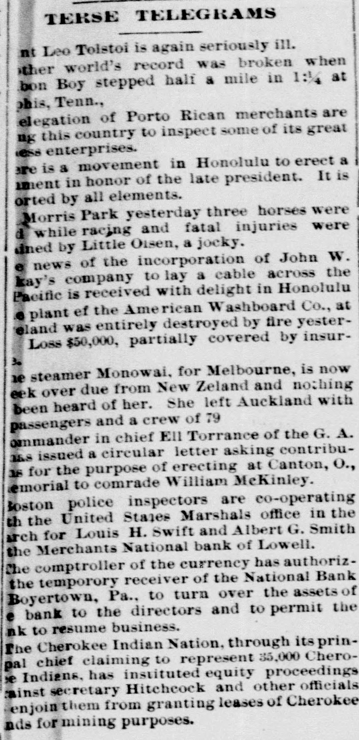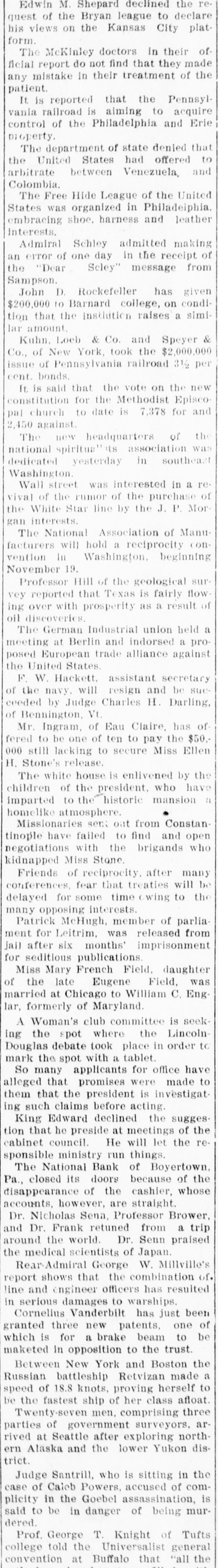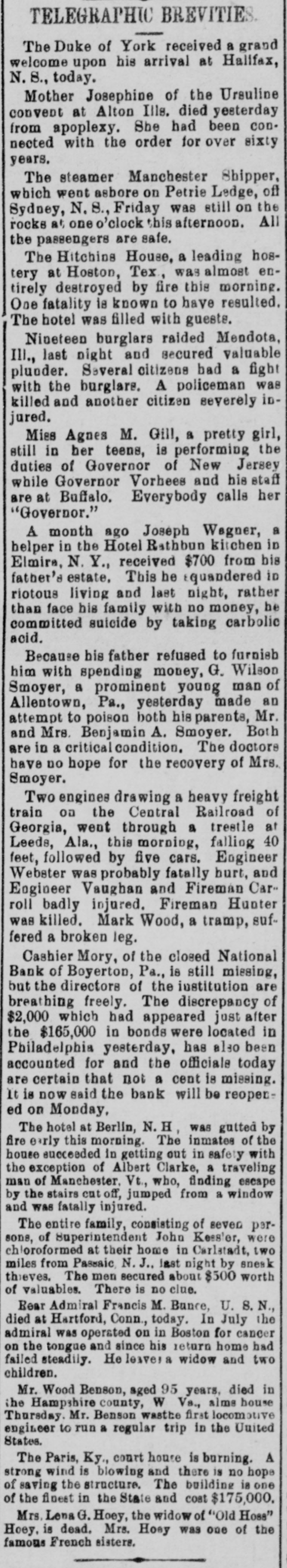 TELEGRAPHIC BREVITIES The Duke of York received a grand welcome upon his arrival at Halifax, N. S., today. Mother Josephine of the Ursuline convent at Alton Ills. died yesterday from apoplexy. She had been connected with the order for over sixty years. The steamer Manchester Shipper, which went asbore on Petrie Ledge, off Sydney, N. S., Friday was still on the rocks at one o'clock this afternoon. All the passengers are safe. The Hitchins House, a leading hostery at Hoston, Tex, was almost entirely destroyed by fire this morning. One fatality 18 known to have resulted. The hotel was filled with guests. Nineteen burglars raided Mendota, III., last night and secured valuable plunder. Several citizens bad a fight with the burglars. A policeman was killed and another citizen severely injured. Miss Agnes M. Gill, a pretty girl, still in her teens, is performing the duties of Governor of New Jersey while Governor Vorhees and his staff are at Buffalo. Everybody calls her "Governor." A month ago Joseph Wagner, a helper in the Hotel Rathbun kitchen in Elmira, N. Y., received $700 from bis father's estate, This he aquandered in riotous living and last night, rather than face his family with no money, be committed suicide by taking carbolic acid. Because his father refused to furnish him with spending money, G. Wilson Smoyer, a prominent young man of Allentown, Pa., yesterday made an attempt to poison both his parents, Mr. and Mrs. Benjamin A. Smoyer. Both are in a criticalcondition. The doctors have no hope for the recovery of Mrs. Smoyer. Two engines drawing a heavy freight train on the Central Railroad of Georgia, went through a trestle at Leeds, Ala., this morning, falling 40 feet, followed by five cars. Engineer Webster was probably fatally burt, and Engineer Vaughan and Fireman Car" roll badly injured. Fireman Hunter was killed. Mark Wood, a tramp, suffered a broken leg. Cashier Mory, of the closed National Bank of Boyerton, Pa., is still missing, but the directors of the institution are breathing freely. The discrepancy of $2,000 which had appeared just after the $165,000 in bonds were located in Philadelphia yesterday, has also been accounted for and the officials today are certain that not a cent is missing. It is now said the bank will be reopened on Monday, The hotel at Berlin, N.H, was gutted by fire early this morning. The inmates of the house succeeded in getting out in safety with the exception of Albert Clarke, a traveling man of Manchester. Vt., who, finding escape by the stairs cut off, jumped from a window and was fatally injured. The entire family, consisting of seven persons, of Superintendent John Kessler, were chloroformed at their home in Carlstadt, two miles from Passaic, N. J., last night by snesk thieves. The men secured about $500 worth of valuables. There is no clue. Rear Admiral Francis M. Bunce, U. S. N., died at Hartford, Conn., today. In July the admiral was operated on in Boston for cancer on the tongue and since his return home had failed steadily. He leave; & widow and two children. Mr. Wood Benson, aged 95 years, died in the Hampshire county, W Va., alms house Thursday. Mr. Benson wasthe first locomotive engineer to run a regular trip in the United States. The Paris, Ky., court house is burning. A strong wind is blowing and there is no hope of saving the structure. The building is one of the finest in the State and cost $175,000. Mrs. Lena G. Hoey, the widow of "Old Hoss" Hoey, is dead. Mrs. Hoey was one of the famous French sisters.