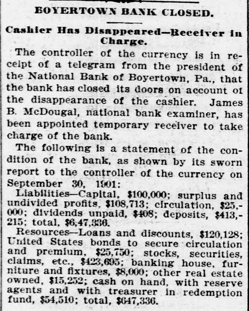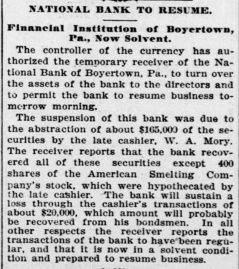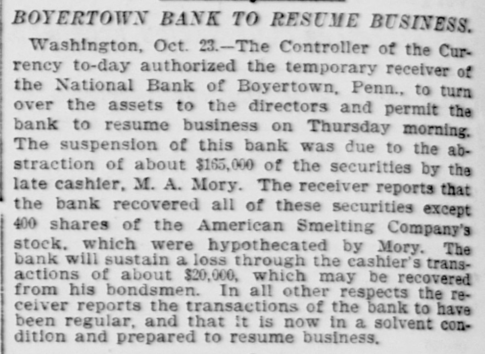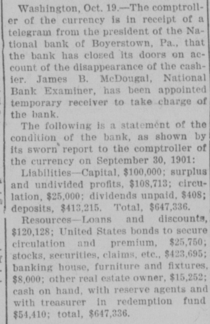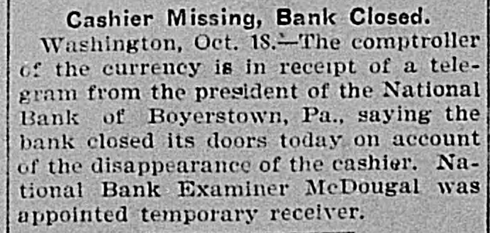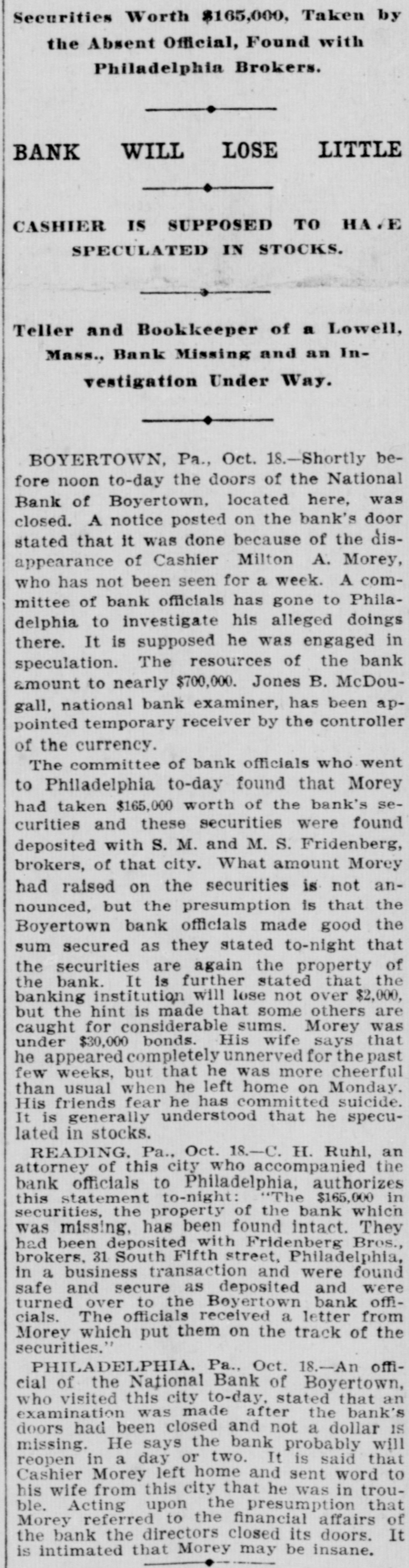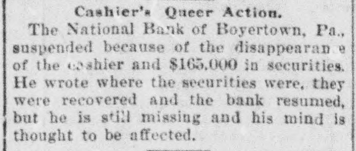 TELEGRAPHIC BREVITIES The Duke of York received a grand welcome upon his arrival at Halifax, N. S., today. Mother Josephine of the Ursuline convent at Alton Ills. died yesterday from apoplexy. She had been connected with the order for over sixty years. The steamer Manchester Shipper, which went asbore on Petrie Ledge, off Sydney, N. S., Friday was still on the rocks at one o'clock this afternoon. All the passengers are safe. The Hitchins House, a leading hostery at Hoston, Tex, was almost entirely destroyed by fire this morning. One fatality 18 known to have resulted. The hotel was filled with guests. Nineteen burglars raided Mendota, III., last night and secured valuable plunder. Several citizens bad a fight with the burglars. A policeman was killed and another citizen severely injured. Miss Agnes M. Gill, a pretty girl, still in her teens, is performing the duties of Governor of New Jersey while Governor Vorhees and his staff are at Buffalo. Everybody calls her "Governor." A month ago Joseph Wagner, a helper in the Hotel Rathbun kitchen in Elmira, N. Y., received $700 from bis father's estate, This he aquandered in riotous living and last night, rather than face his family with no money, be committed suicide by taking carbolic acid. Because his father refused to furnish him with spending money, G. Wilson Smoyer, a prominent young man of Allentown, Pa., yesterday made an attempt to poison both his parents, Mr. and Mrs. Benjamin A. Smoyer. Both are in a criticalcondition. The doctors have no hope for the recovery of Mrs. Smoyer. Two engines drawing a heavy freight train on the Central Railroad of Georgia, went through a trestle at Leeds, Ala., this morning, falling 40 feet, followed by five cars. Engineer Webster was probably fatally burt, and Engineer Vaughan and Fireman Car" roll badly injured. Fireman Hunter was killed. Mark Wood, a tramp, suffered a broken leg. Cashier Mory, of the closed National Bank of Boyerton, Pa., is still missing, but the directors of the institution are breathing freely. The discrepancy of $2,000 which had appeared just after the $165,000 in bonds were located in Philadelphia yesterday, has also been accounted for and the officials today are certain that not a cent is missing. It is now said the bank will be reopened on Monday, The hotel at Berlin, N.H, was gutted by fire early this morning. The inmates of the house succeeded in getting out in safety with the exception of Albert Clarke, a traveling man of Manchester. Vt., who, finding escape by the stairs cut off, jumped from a window and was fatally injured. The entire family, consisting of seven persons, of Superintendent John Kessler, were chloroformed at their home in Carlstadt, two miles from Passaic, N. J., last night by snesk thieves. The men secured about $500 worth of valuables. There is no clue. Rear Admiral Francis M. Bunce, U. S. N., died at Hartford, Conn., today. In July the admiral was operated on in Boston for cancer on the tongue and since his return home had failed steadily. He leave; & widow and two children. Mr. Wood Benson, aged 95 years, died in the Hampshire county, W Va., alms house Thursday. Mr. Benson wasthe first locomotive engineer to run a regular trip in the United States. The Paris, Ky., court house is burning. A strong wind is blowing and there is no hope of saving the structure. The building is one of the finest in the State and cost $175,000. Mrs. Lena G. Hoey, the widow of "Old Hoss" Hoey, is dead. Mrs. Hoey was one of the famous French sisters.