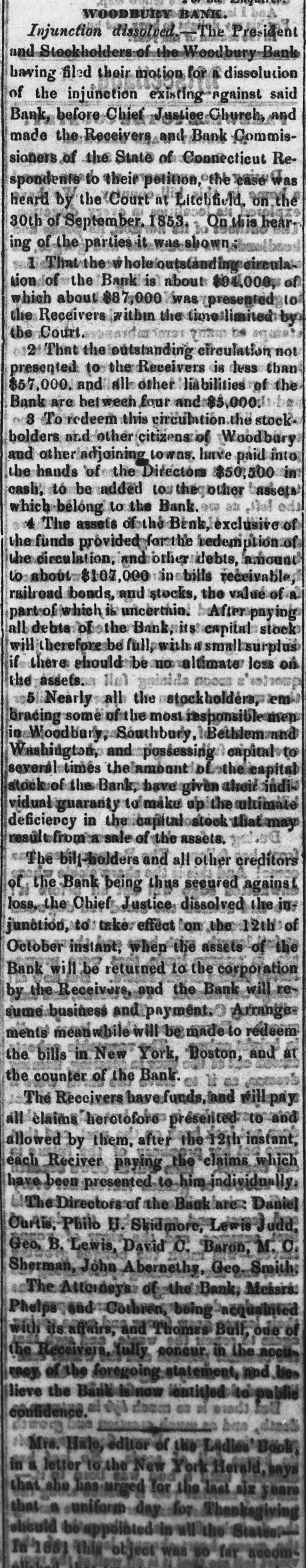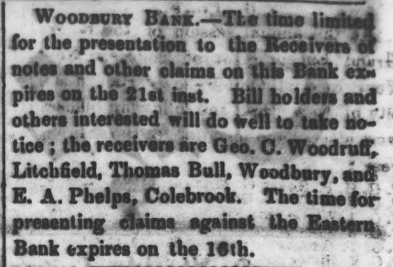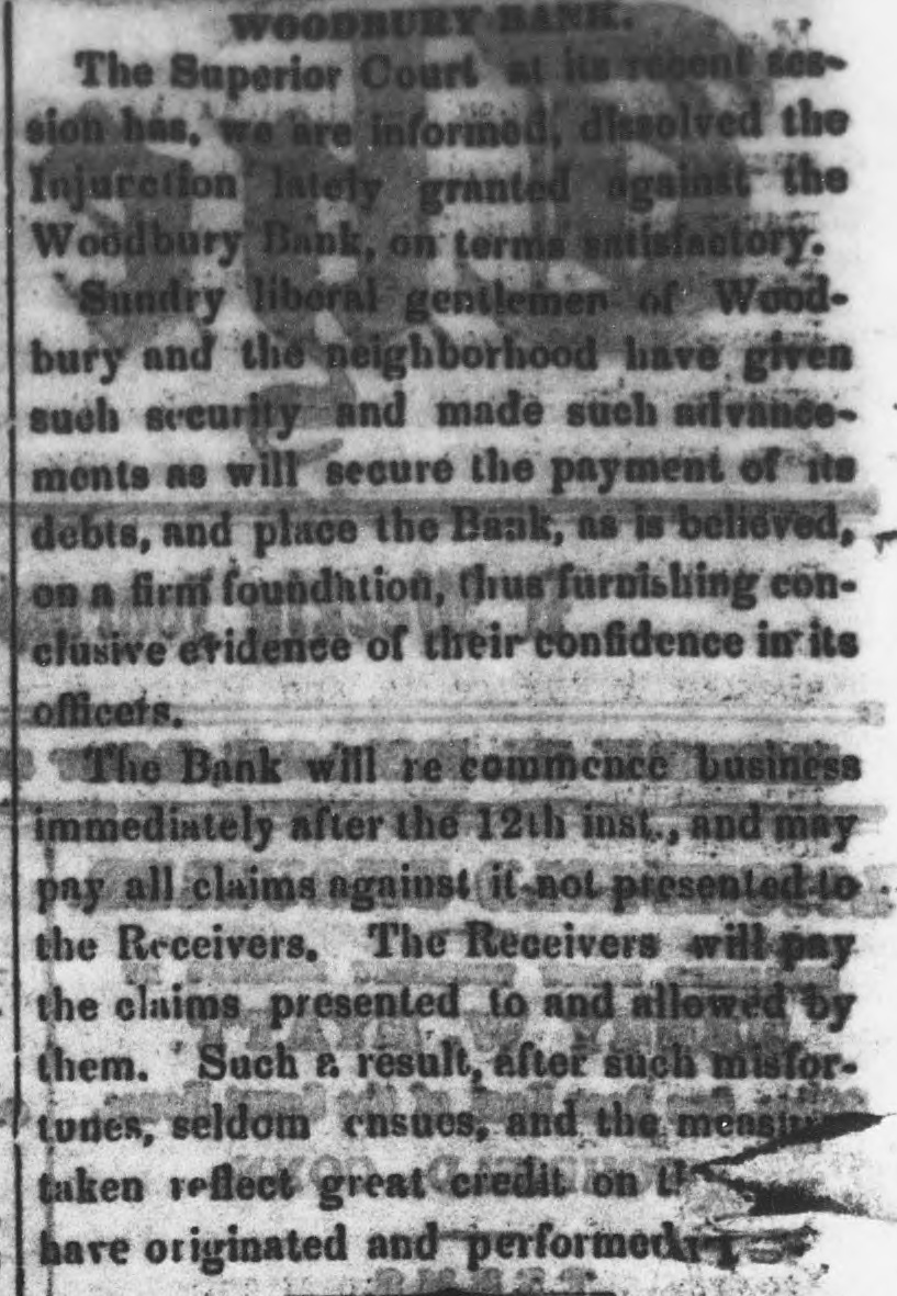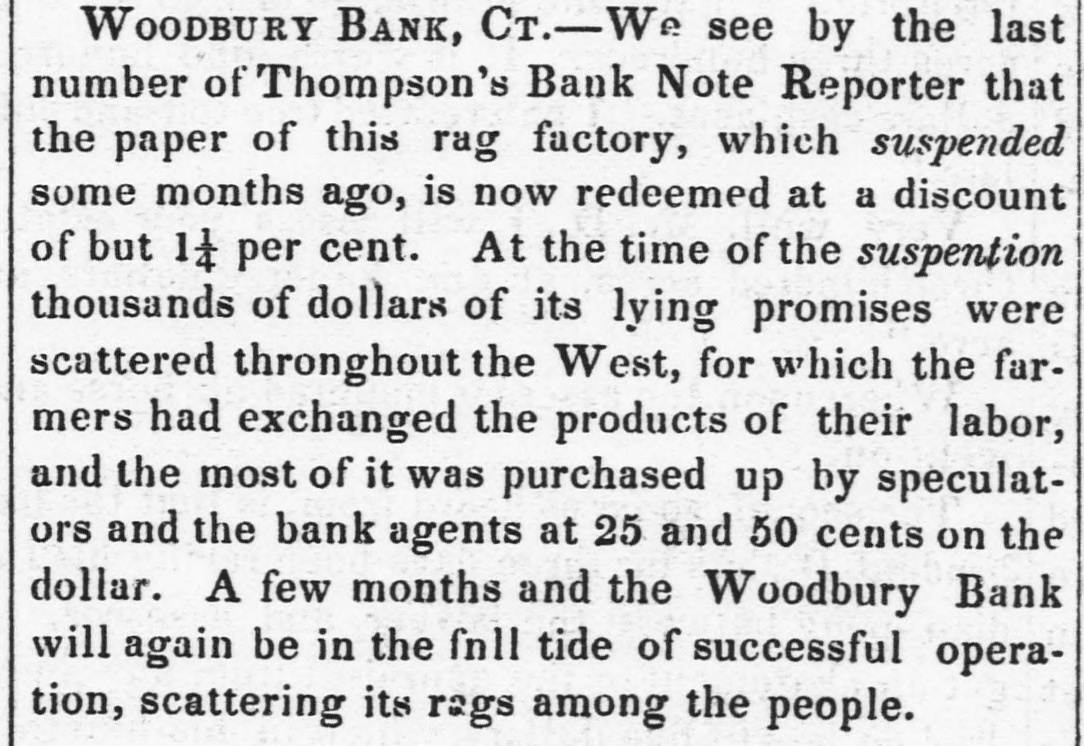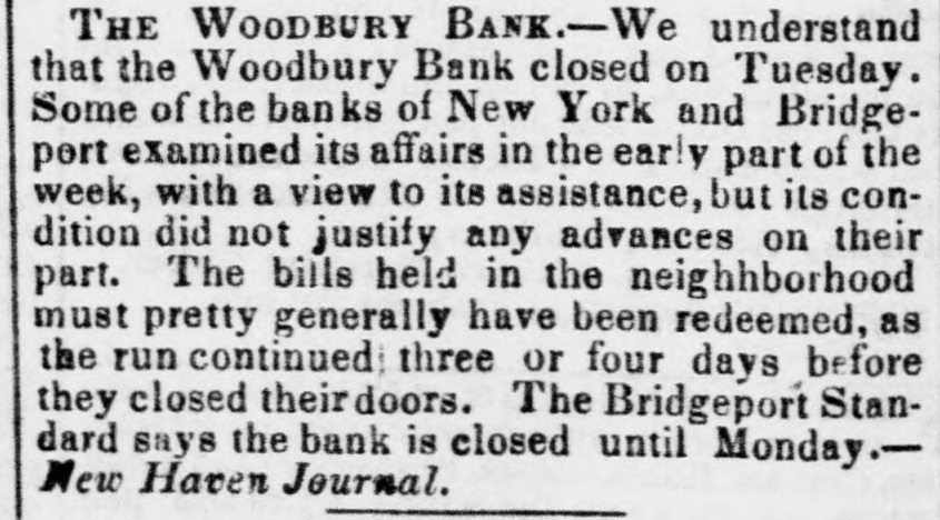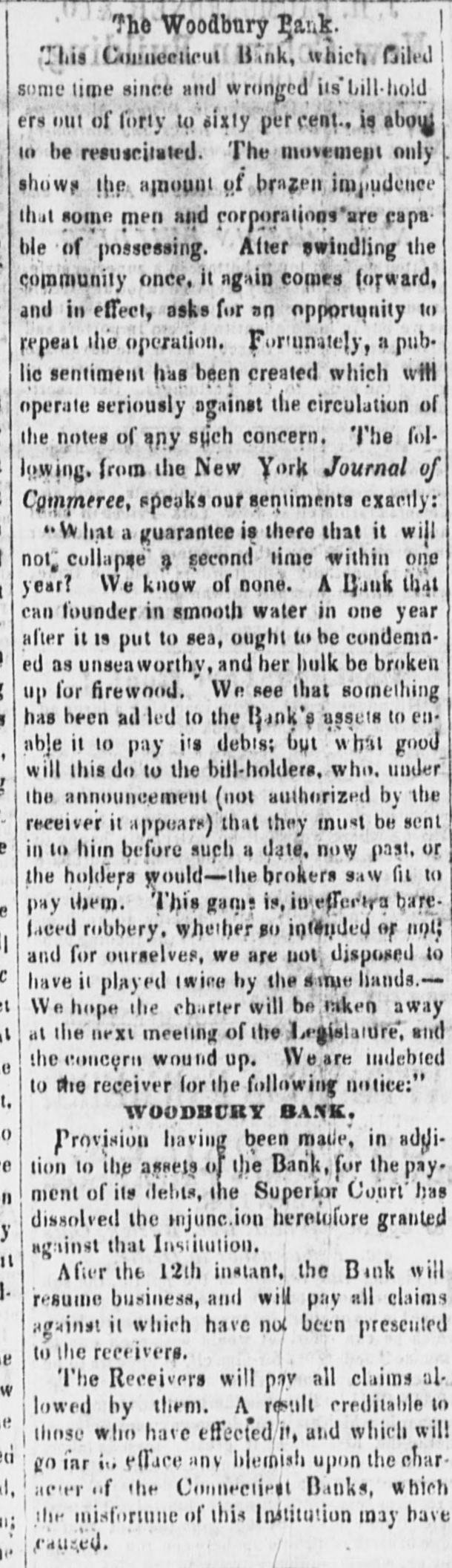 Thompson's Reporter says-The Woodbury Bank, Connecticut, was thrown out by the New York Banks od Thursday.